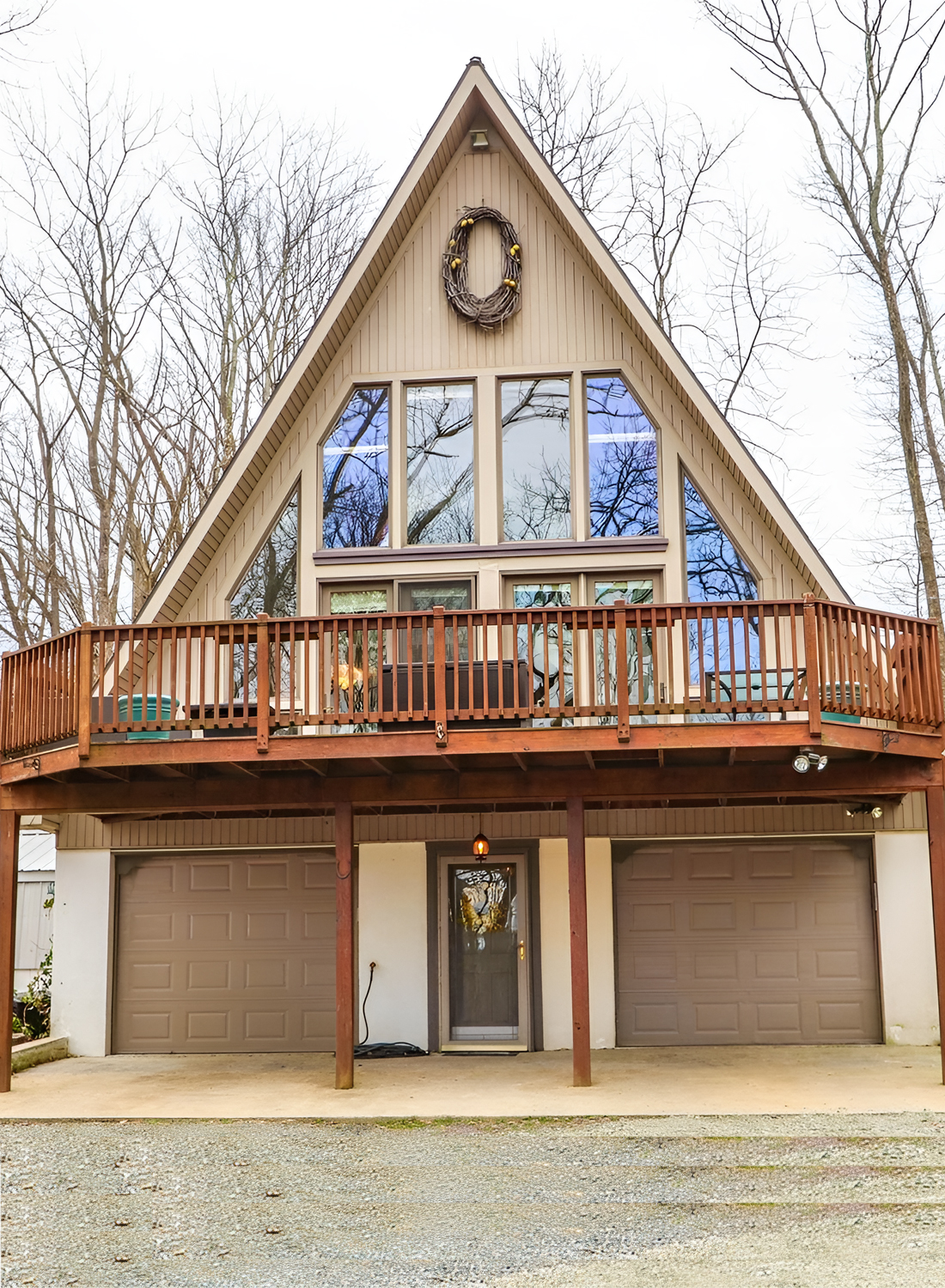 This design is clever because it solves two needs at once. The garage sits below, while the balcony stretches across the front above it. That means the house gains outdoor space without needing a bigger footprint on the ground. The railings add warmth, and the large front windows keep the upper level from feeling boxed in. Even the wreath at the peak softens the sharp lines. This is a practical A-frame idea for smaller lots or homes that need storage and outdoor space in one package.