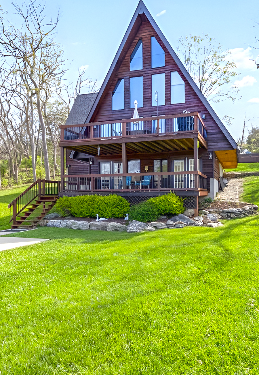 This home takes the A-frame balcony idea to a much larger scale. The upper balcony stretches across a dramatic wall of glass, which gives the house a bold lodge feel. Then the lower covered terrace adds another outdoor layer, making the whole back facade feel made for gathering. The dark wood finish adds richness, while the open lawn and water view give the balcony real purpose. This is the kind of design that turns the exterior into part of the vacation experience.