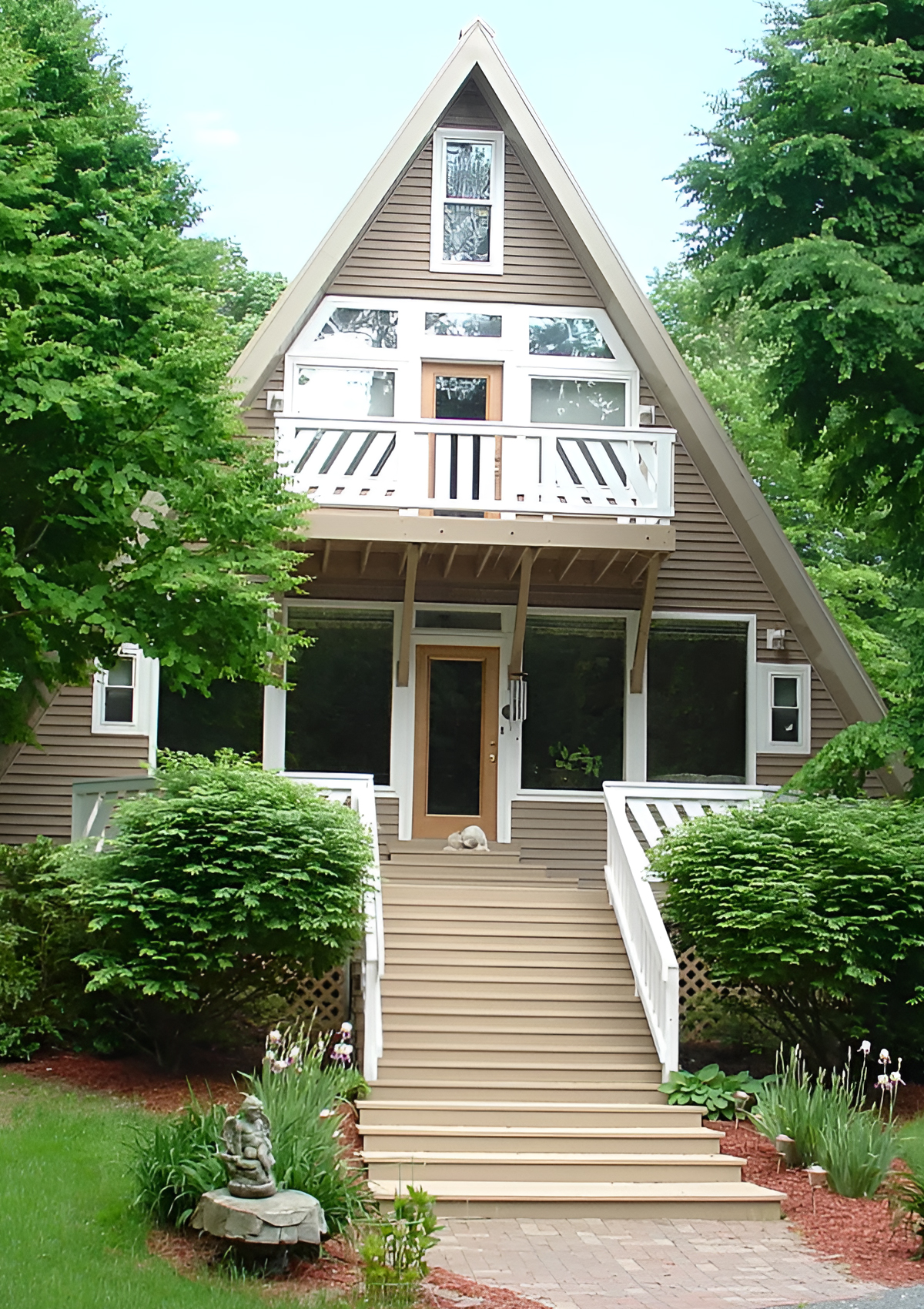 This A-frame feels warm and welcoming from the first glance. The centered stair, trimmed shrubs, and white balcony rail give the front a neat, classic look. Because the balcony sits right above the entry, it creates a lovely layered facade without taking away from the tall triangular shape. The white trim also pops against the soft taupe siding, so the house feels crisp and bright even under a canopy of trees. It is a great example of how a modest balcony can make a wooded cabin look polished and timeless.