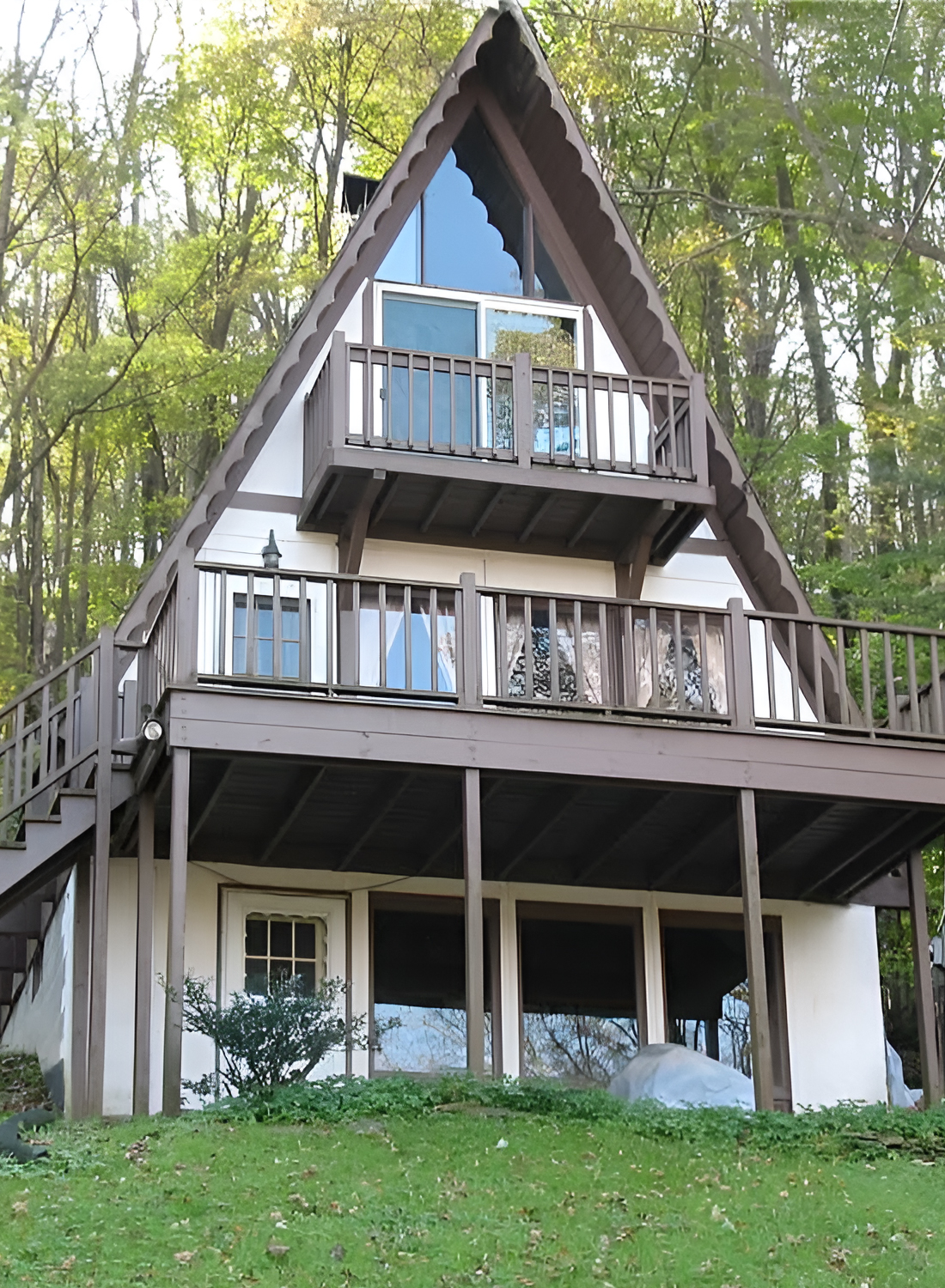 This house proves that an A-frame balcony can do a lot of visual work. The front has a raised main deck, then another balcony above it, which creates a stacked look that feels tall and dramatic. The exterior stair on the side adds easy access and gives the facade a chalet-like feel. Because the house sits in the woods, the elevated decks also make good sense for views and ventilation. This design feels adventurous, almost like a treehouse for grown-ups.