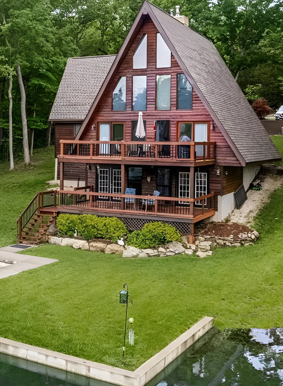 This A-frame mixes rustic charm with a more traditional porch-like layout. The full-width upper balcony adds strong symmetry, while the lower covered deck makes the front feel grounded and usable. The stone chimney gives the facade weight, which is important in a design with so much open railing. There is also a nice balance between the triangle form and the straight balcony lines. Together, they create a home that feels both relaxed and well built. It has a classic vacation-house feel.