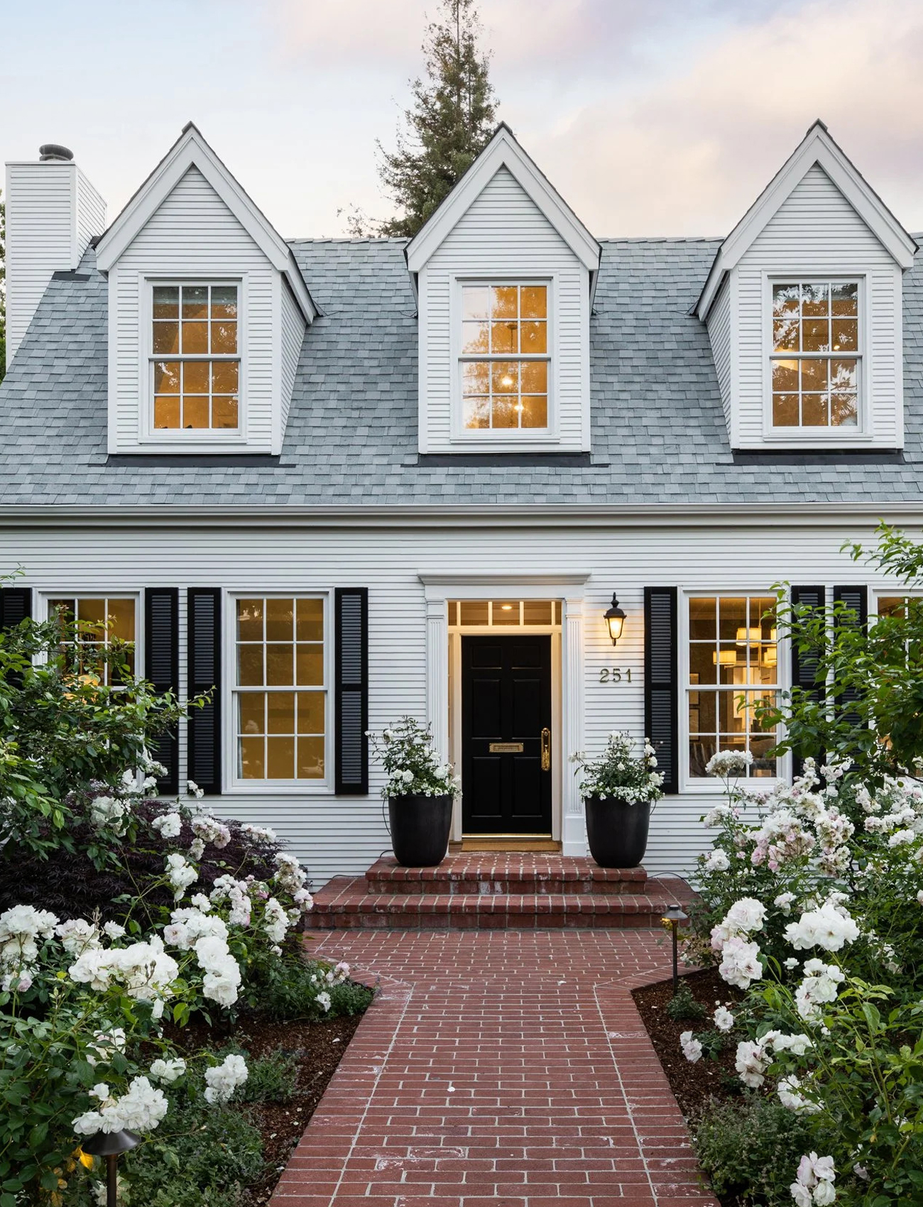 To keep this design from feeling flat, layer in texture. Use cedar shingles, clapboard siding, or both. Then add a brick walkway, simple foundation shrubs, and a glossy black front door. The result feels classic, but still full of life.