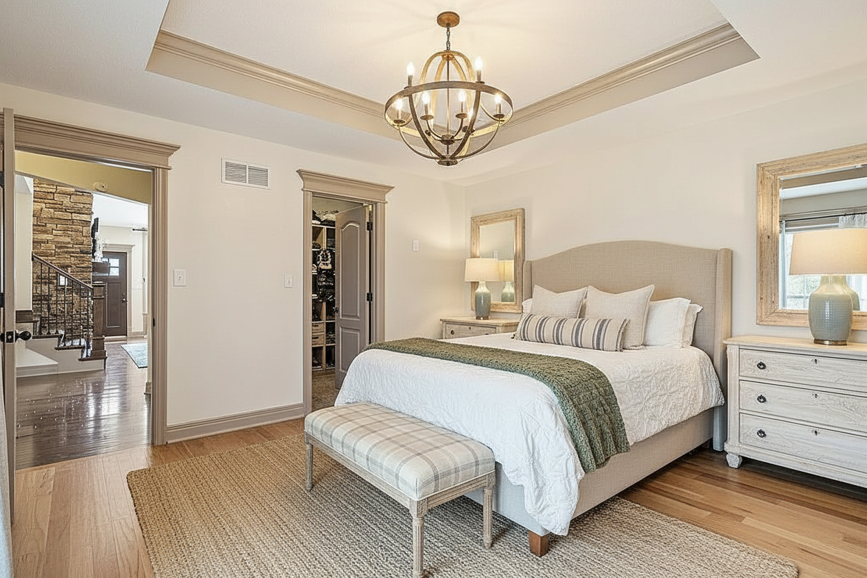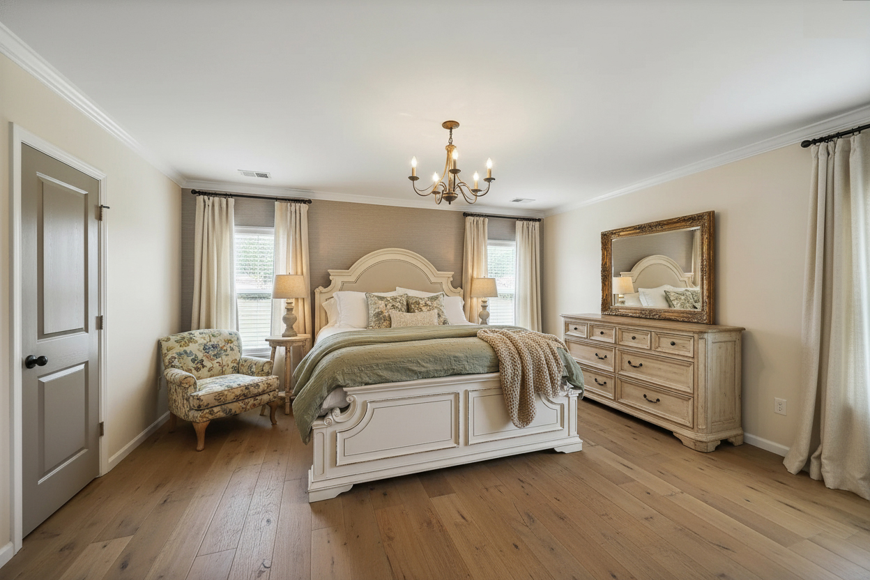 A bedroom should feel peaceful. It should help you rest, recharge, and breathe a little deeper. That is exactly why French country modern works so well here.