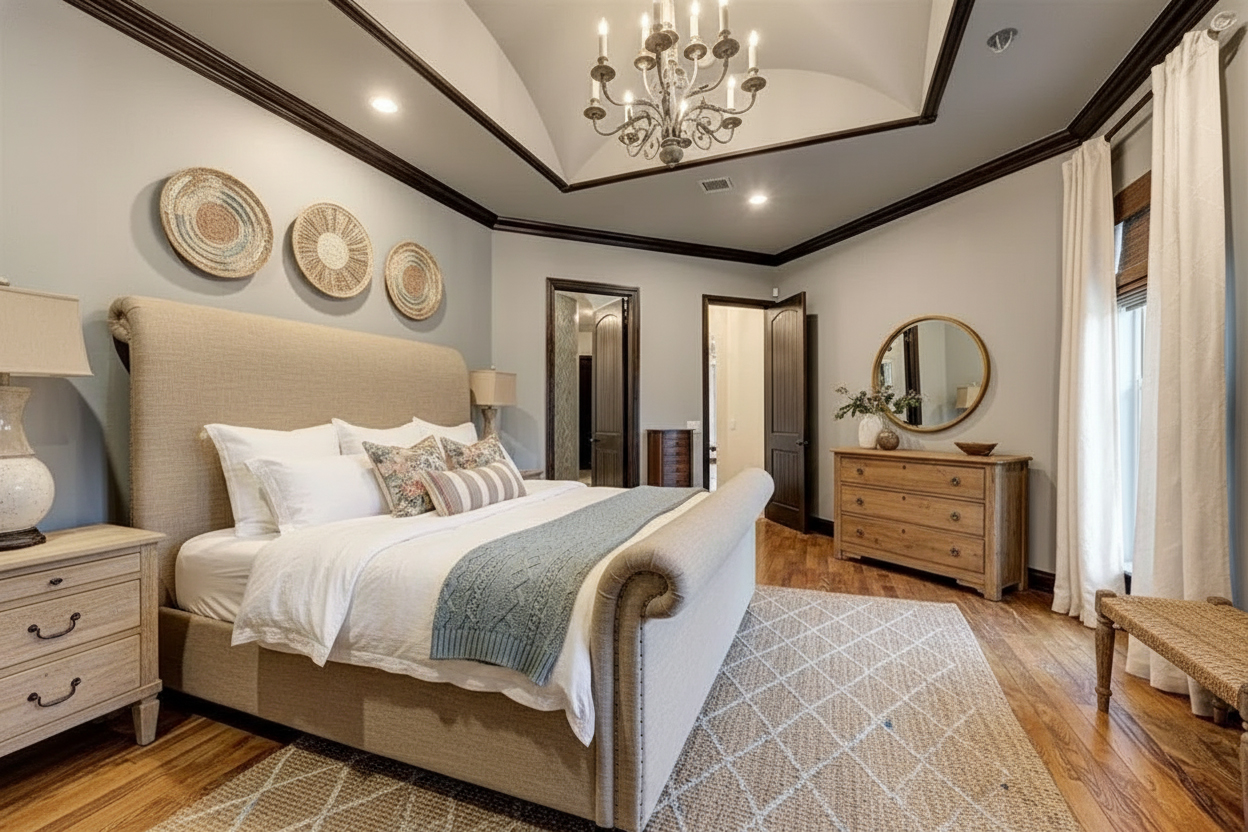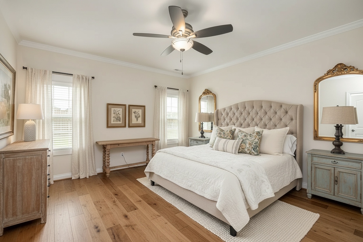 For example, pair a rustic wood bench with a streamlined bed. Use a weathered dresser beside a simple mirror. Add nightstands with clean lines, then top them with classic lamps. This contrast keeps the room from feeling too themed or too plain.