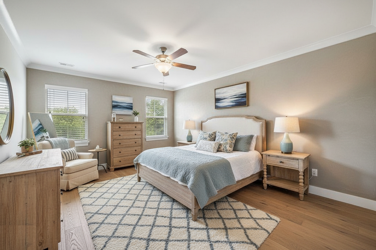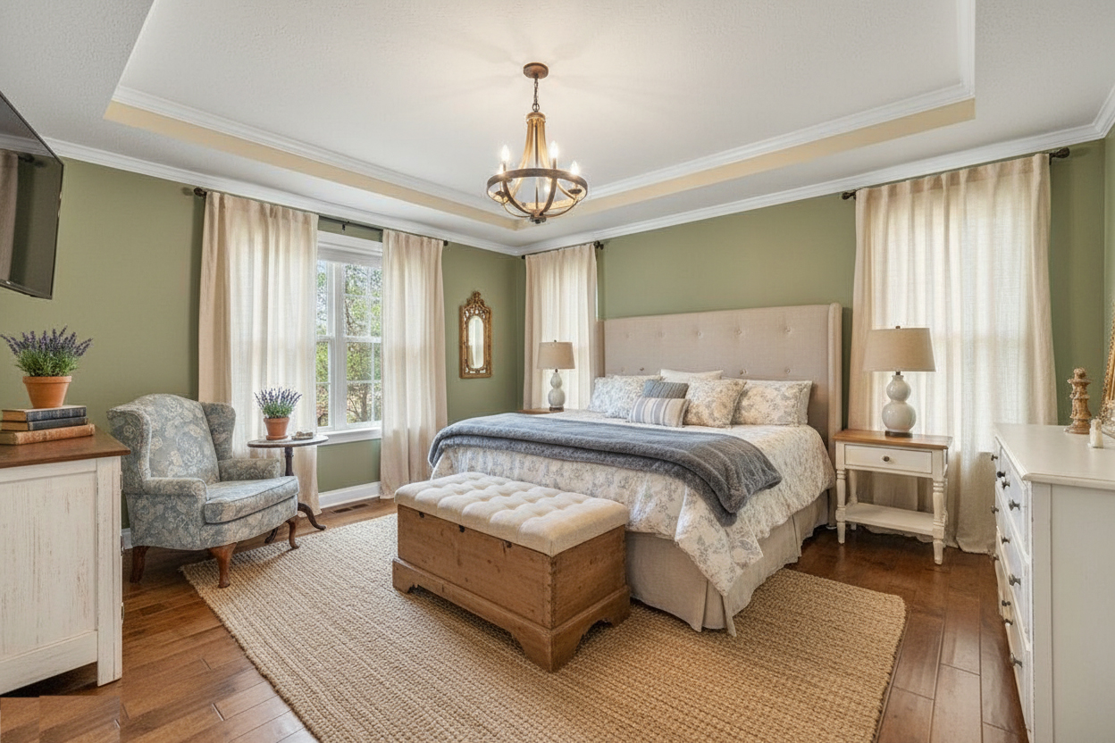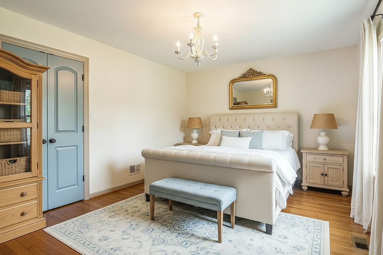 The easiest way to get this look is to begin with color. French country modern bedrooms almost always feel light and airy. That means the palette should stay soft, calm, and easy on the eyes.