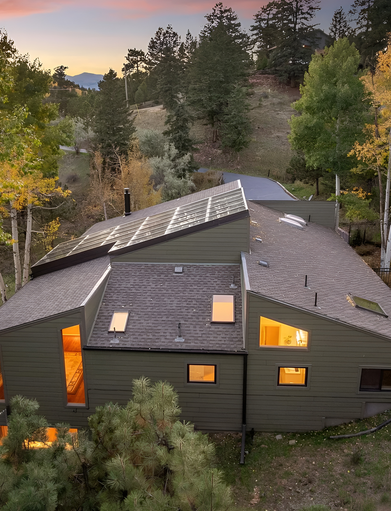 Skylights bring another layer of interest. From above, they break up the roof surface and hint at bright interiors inside. The narrow and angled windows do something similar. They make the exterior feel custom and thoughtful, not generic.