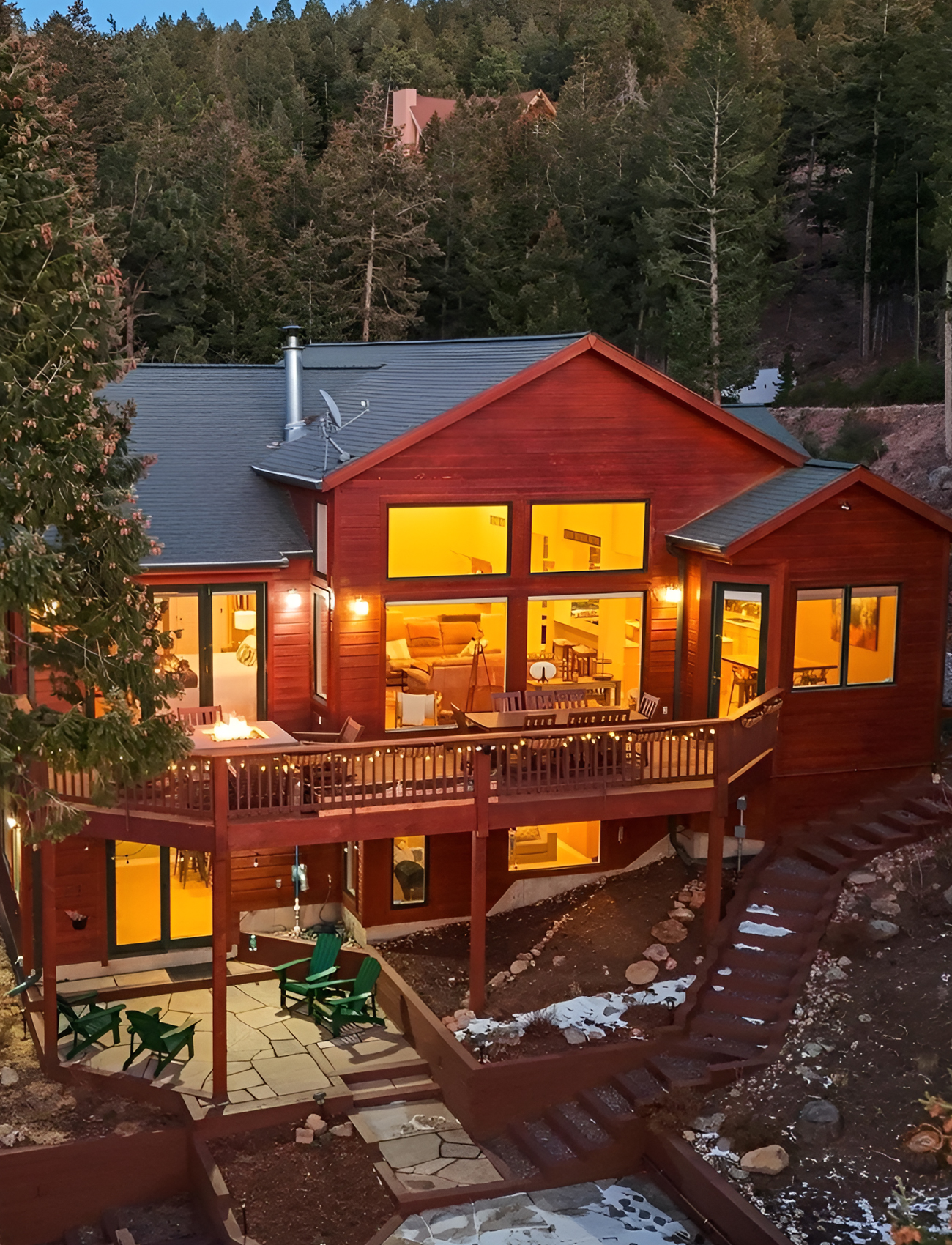This house has a rich, glowing presence, especially at dusk. The reddish wood siding catches the light beautifully and makes the whole home feel warm from a distance. Against the rocky, wooded slope, that warmth feels inviting and strong.