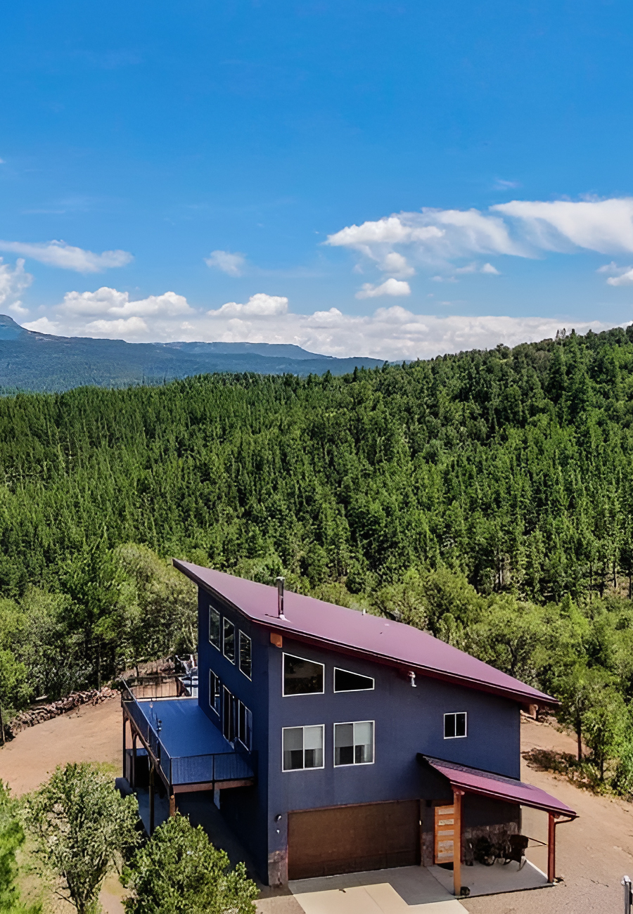 This home proves that one strong shape can carry an entire exterior. The dramatic angled roof gives the house a clear identity right away. It feels crisp, modern, and a little adventurous, which suits the open mountain setting around it.