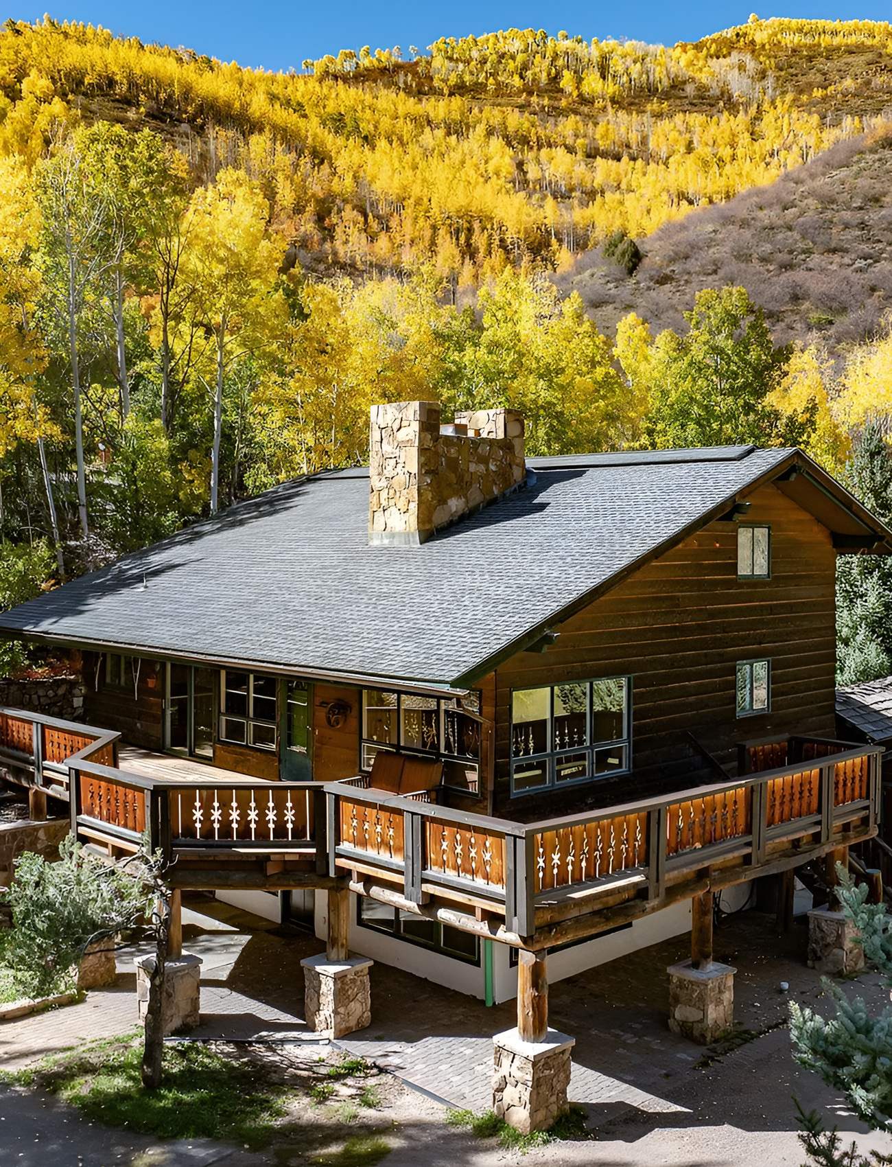 The stain color is important as well. It is rich, warm, and dark enough to stand out against the bright aspens. Yet it still feels natural. That is the sweet spot for mountain wood exteriors.