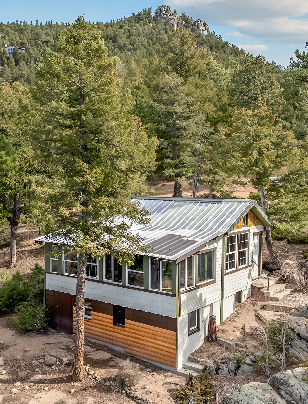 The mixed exterior materials tell a big part of the story. The metal roof gives the house a rugged, durable look that feels right for the mountains. The enclosed porch adds function and charm, while the wood-look lower section brings warmth to the facade. The painted upper siding keeps the whole composition light enough to stand out among the trees.