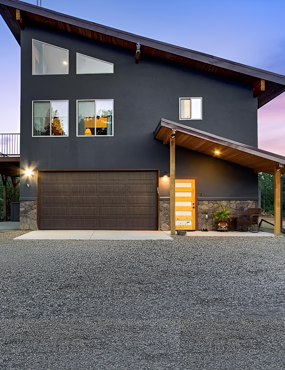 The simple gravel approach fits the setting too. It feels rugged, casual, and low maintenance. That suits a mountain home much better than a fussy front yard would. Meanwhile, the small covered porch gives the entry a sheltered, welcoming feel without taking away from the clean lines.