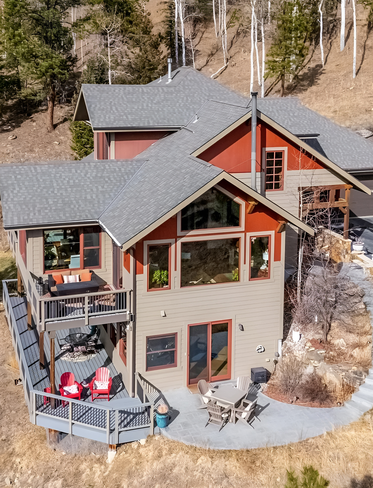 The color palette is a big reason this design feels warm. The taupe siding works as a soft neutral, while the rusty red accents add mountain character. That earthy red picks up the tones of surrounding soil, rock, and wood, so it feels grounded instead of random. It also gives the house more personality.
