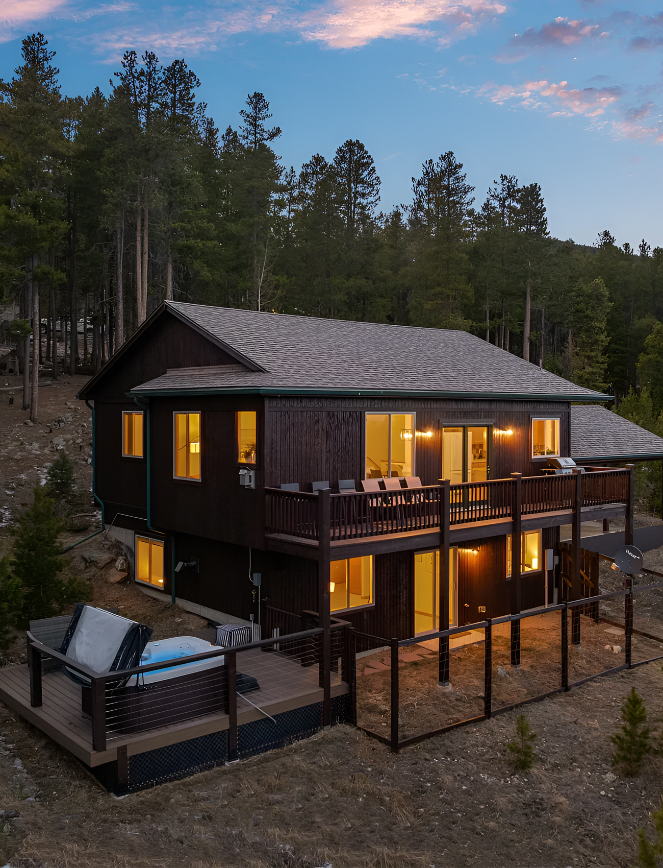This home feels calm, private, and deeply connected to the woods around it. The dark stained exterior helps it blend into the site, while the warm light from the windows makes it feel cozy and inviting. That contrast is one of the most appealing things about mountain homes at dusk.