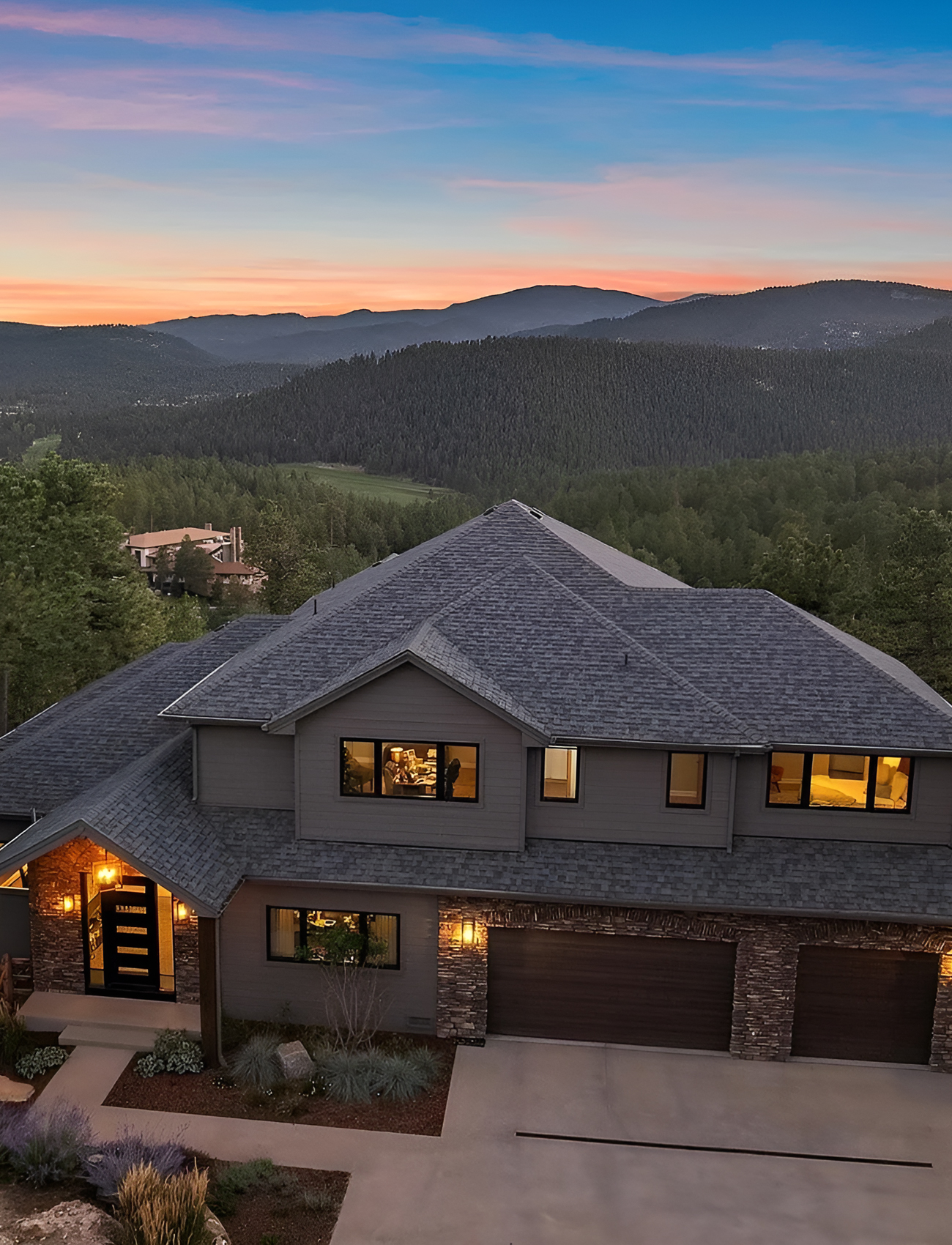 This exterior feels polished, upscale, and very livable. The dark gray siding gives it a contemporary mountain mood, while the stacked stone at the garage and entry adds the rugged texture people expect in this setting. The result feels refined but not too formal.