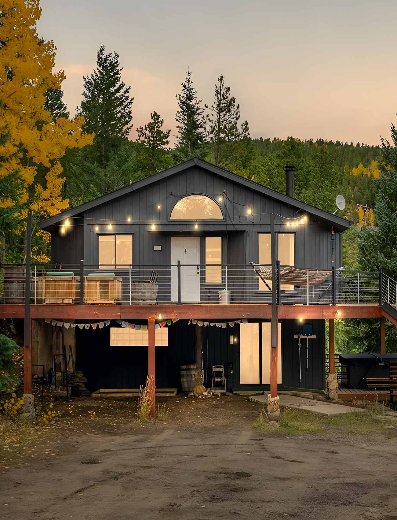 13. Black Cabin With String Lights and a Big Wraparound Deck