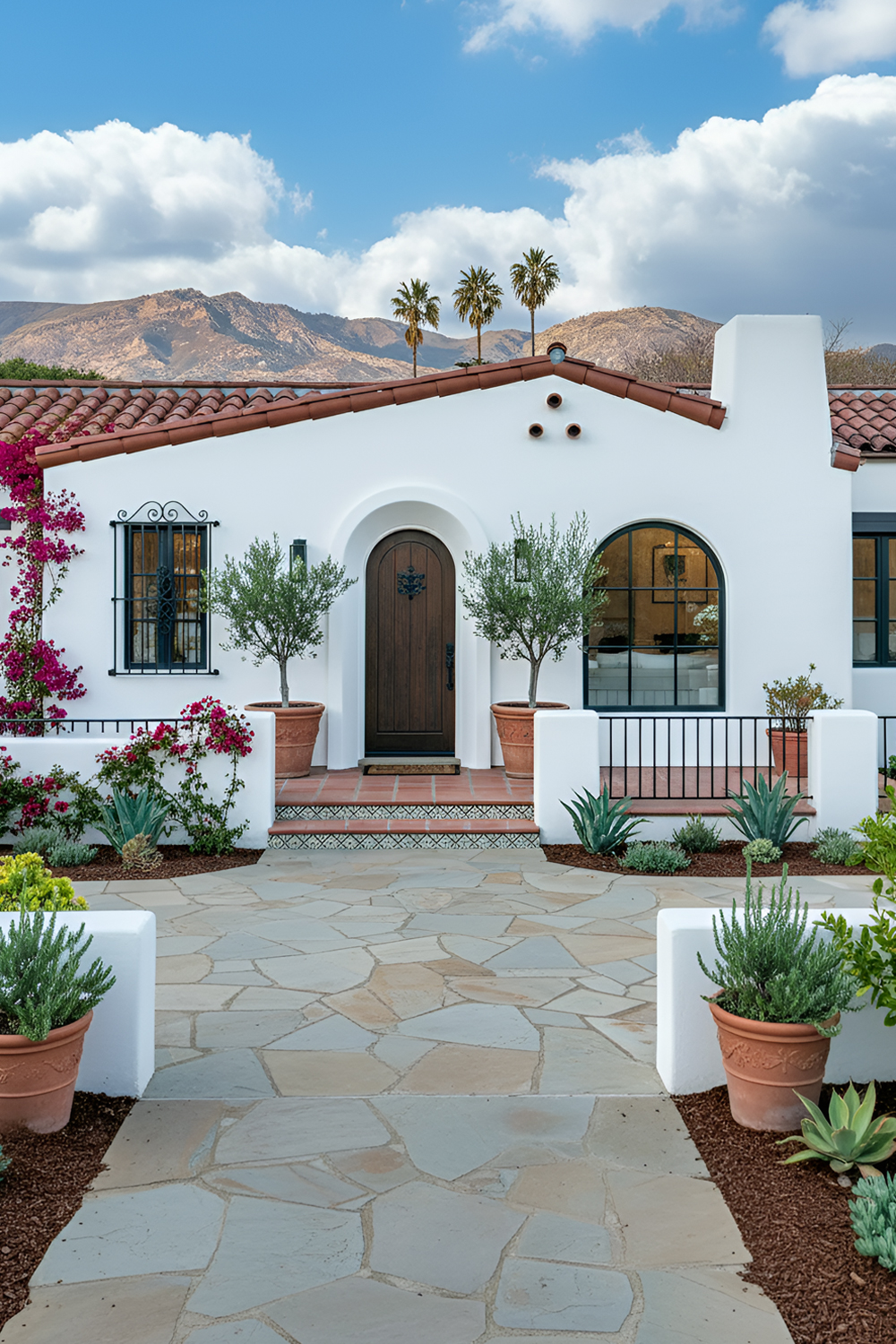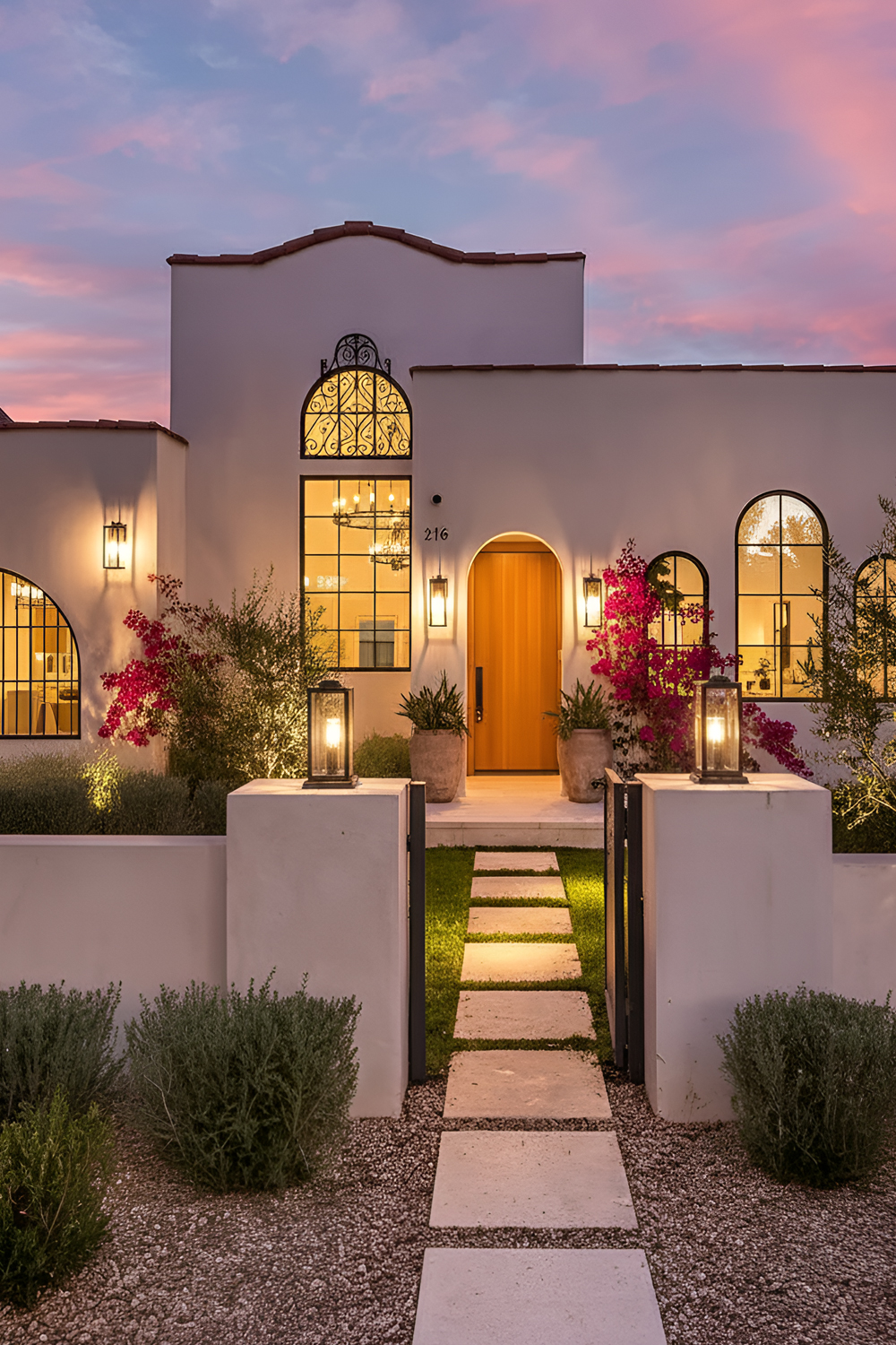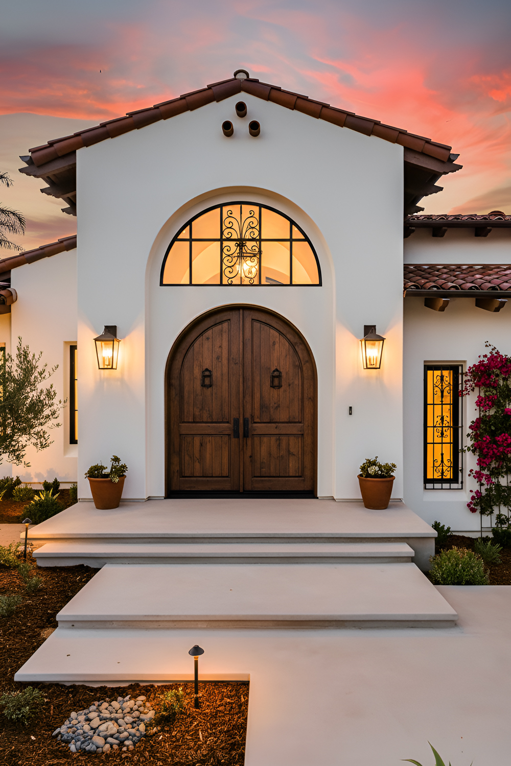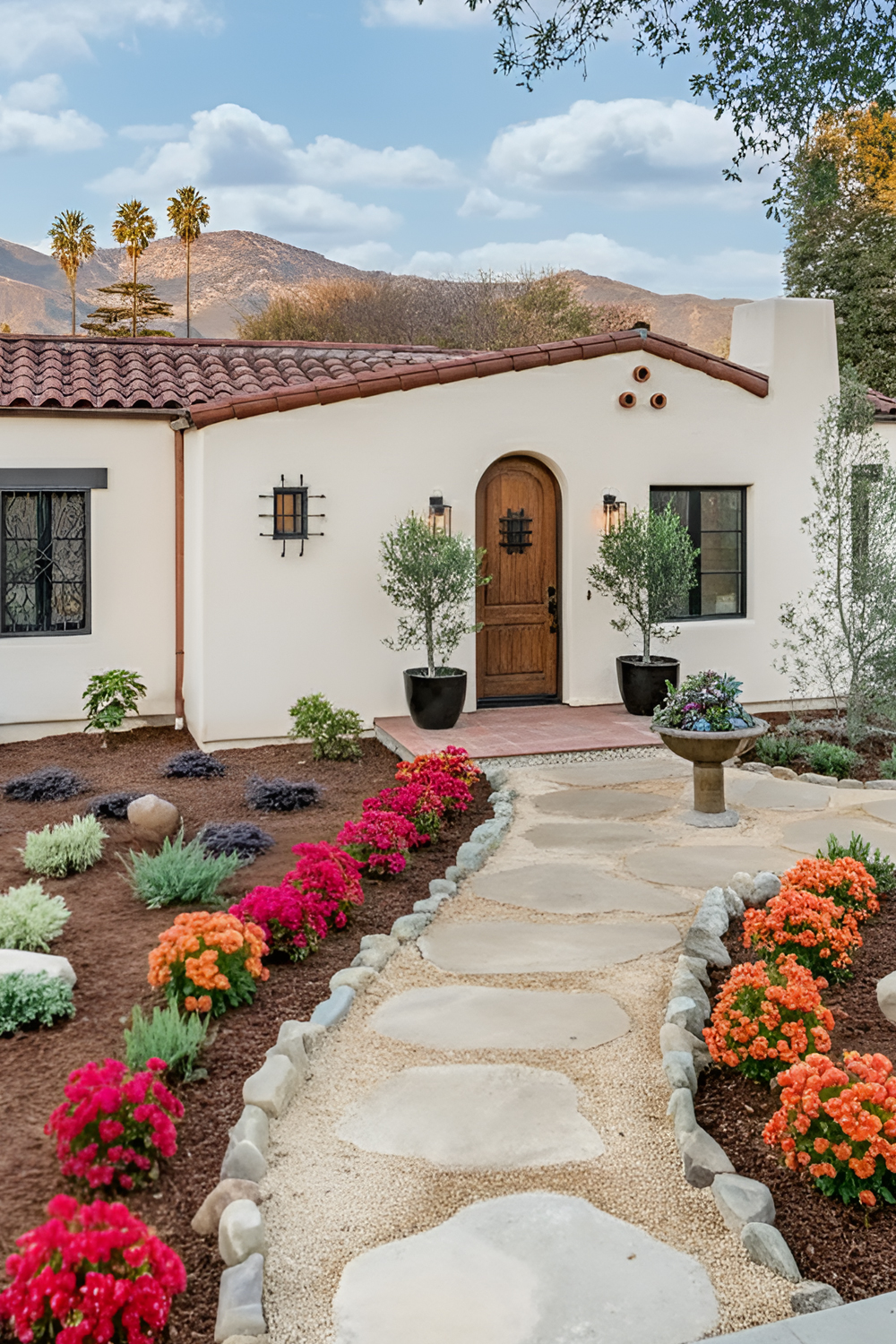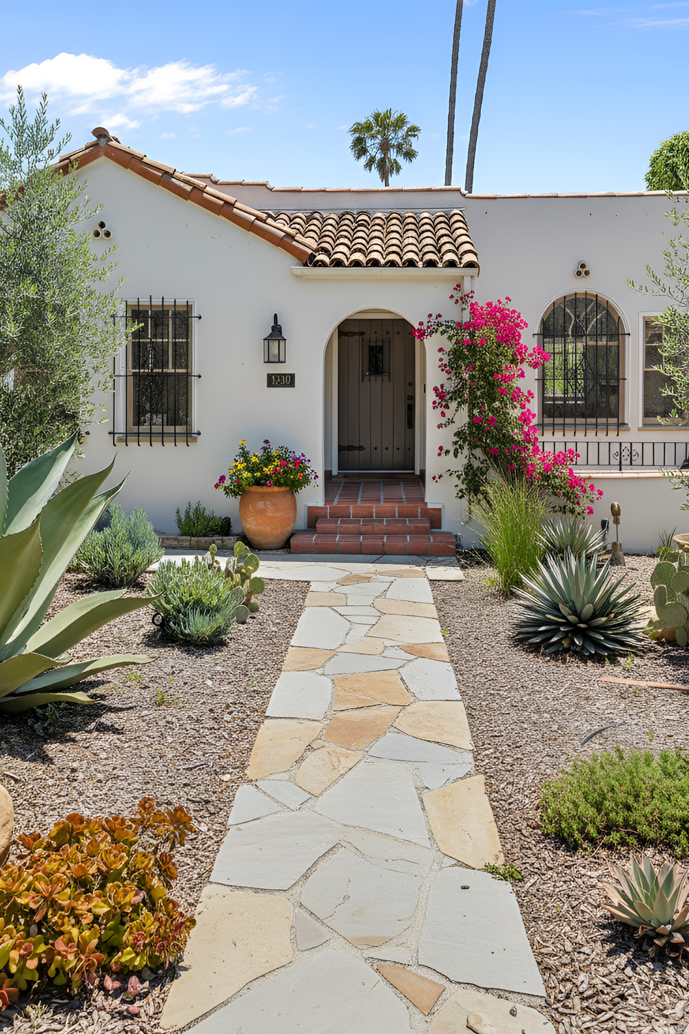 This kind of landscaping supports the architecture rather than hiding it. You can see the stucco walls. You can notice the arches. You can appreciate the doorway. Everything feels more intentional.