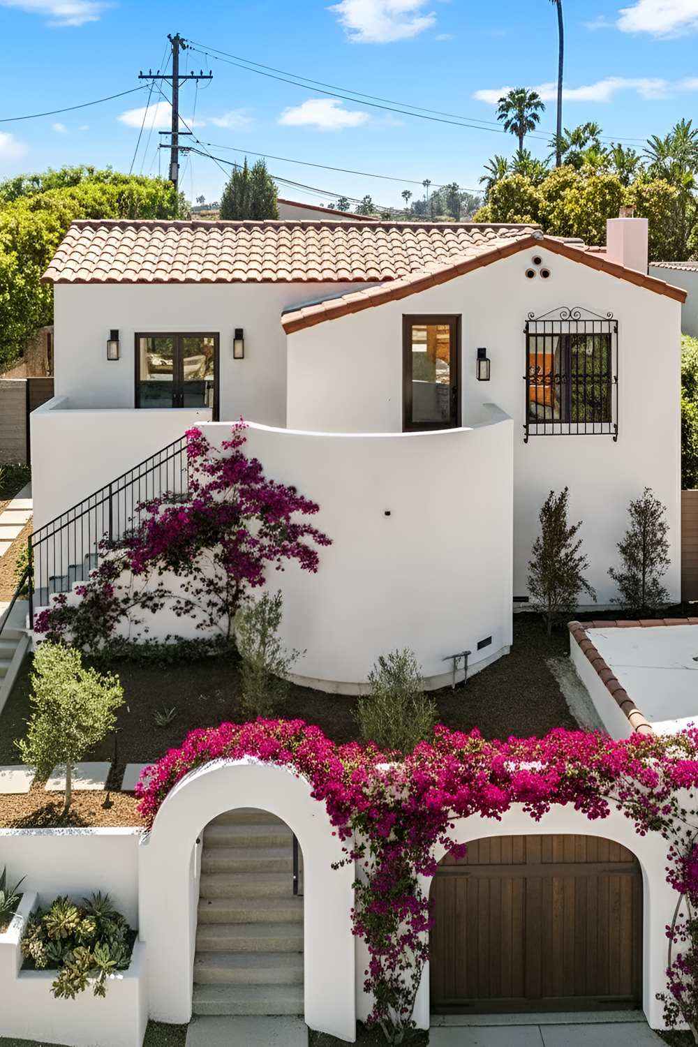 This is one of the easiest ways to create a modern Spanish exterior. Start with smooth white or soft ivory stucco. Then bring in warm wood details to add depth and softness. Think wood front doors, exposed beams, garage doors, or pergolas.