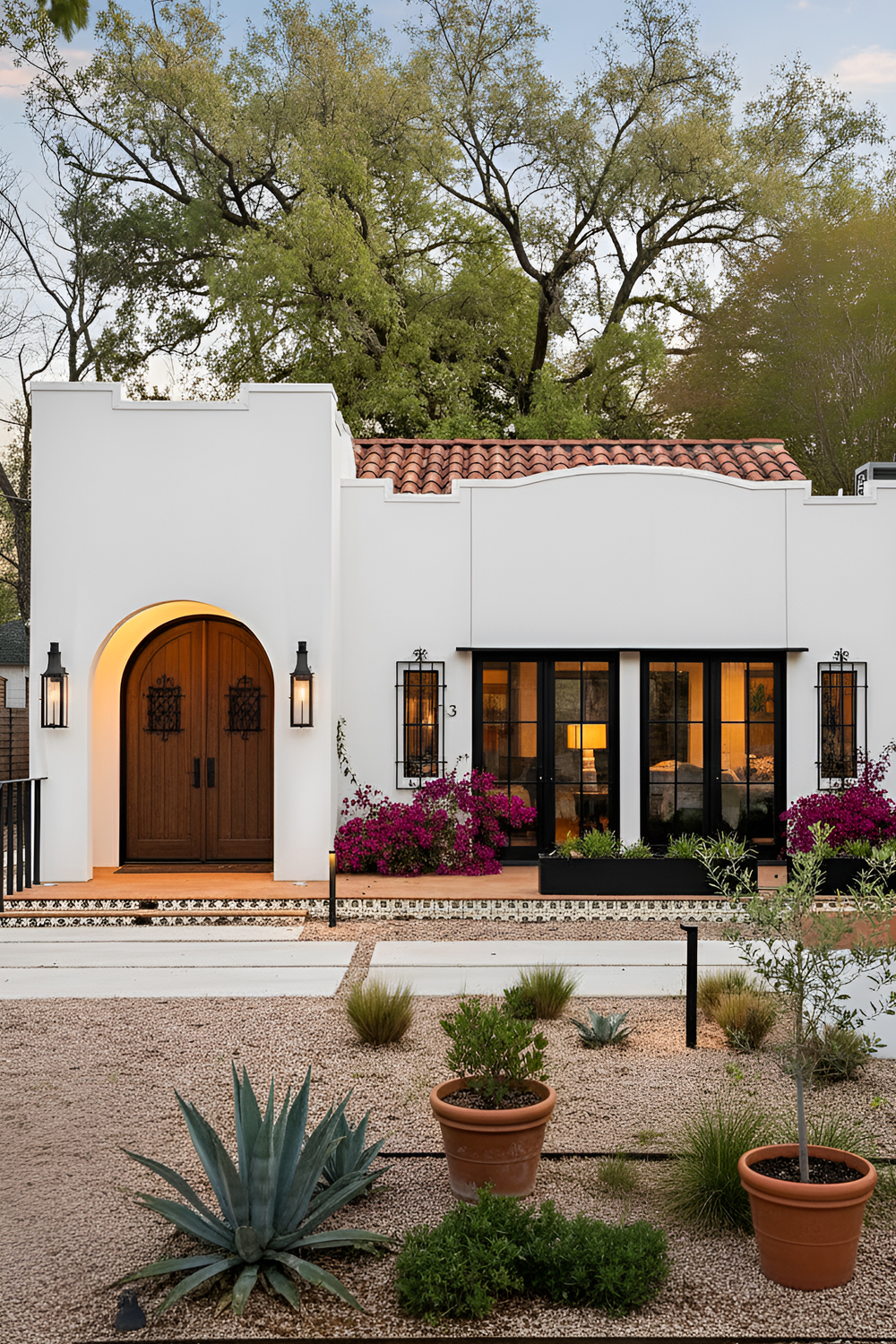 If you want a Spanish exterior to feel more modern right away, black-framed windows can do a lot of the work. They add contrast, definition, and a fresh edge to softer Spanish features like stucco and arches.