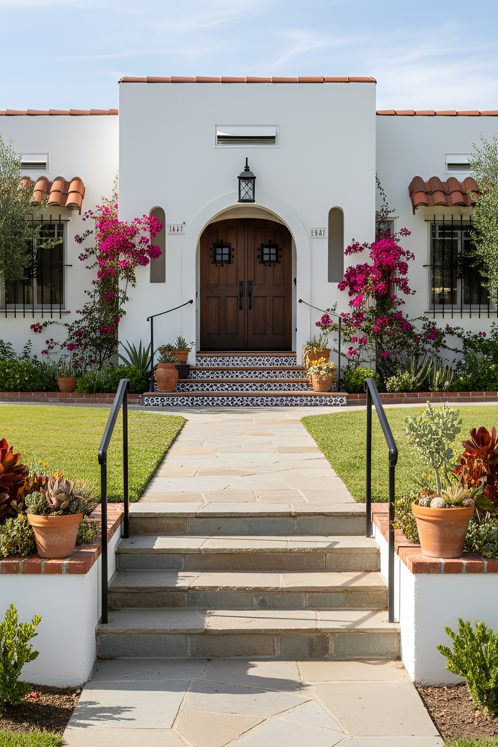 This kind of entry feels memorable because it adds a human touch. Stucco and tile create the backdrop, but the wood door adds soul. It also makes the house feel grounded and welcoming, which is a big part of Spanish style.