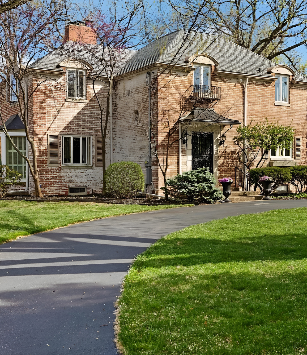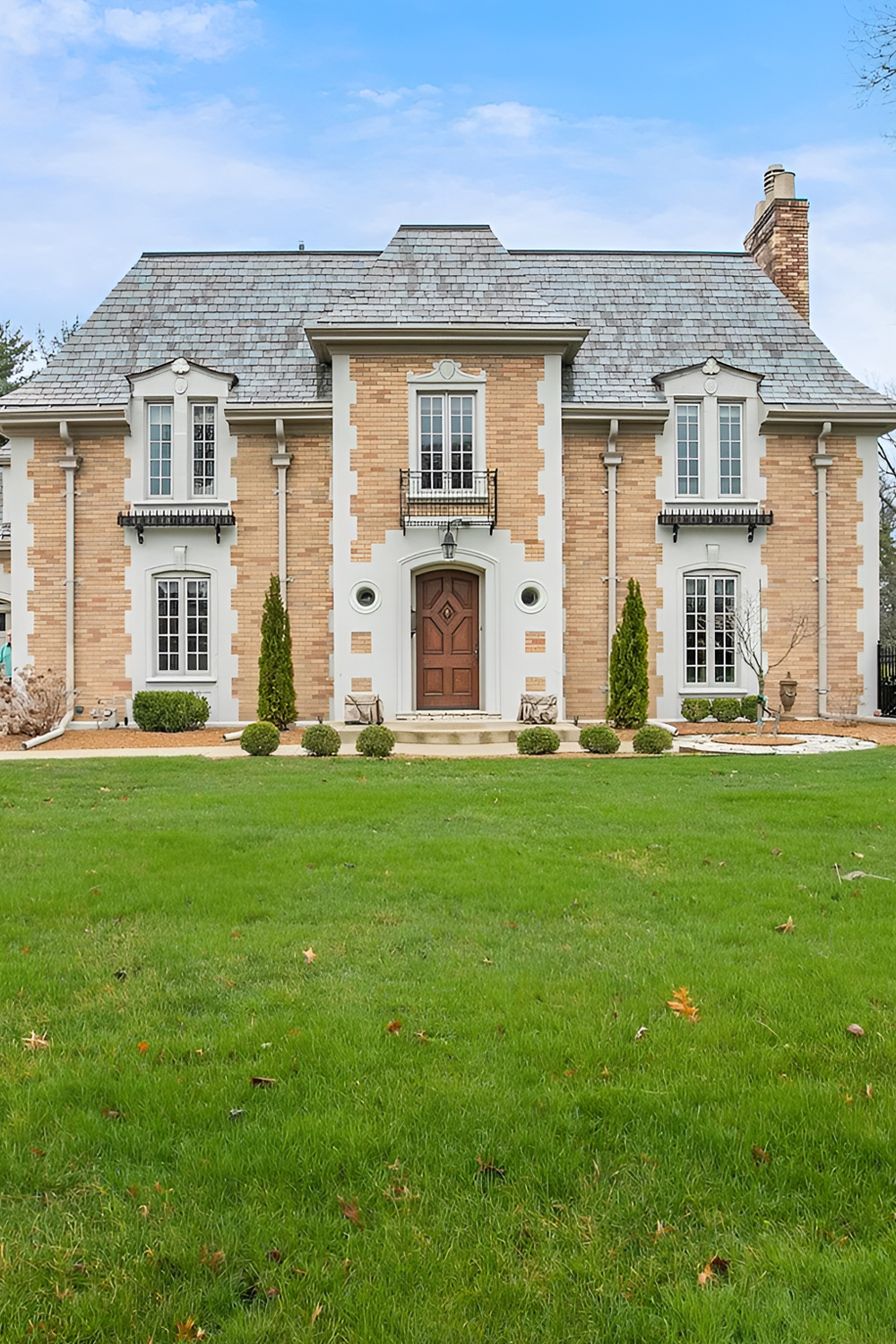 Tall and stately, this brick chateau stands out with classic symmetry and sharp detailing. Creamy trim highlights the arched windows and doors, while decorative quoins at the corners add a touch of grandeur. Wrought iron accents, from small Juliet balconies to the lanterns at the front, channel timeless French style. Manicured shrubs and a broad lawn set the house back from the street, making the entry feel grand and private. This home blends stately elegance with a feeling of homey comfort.