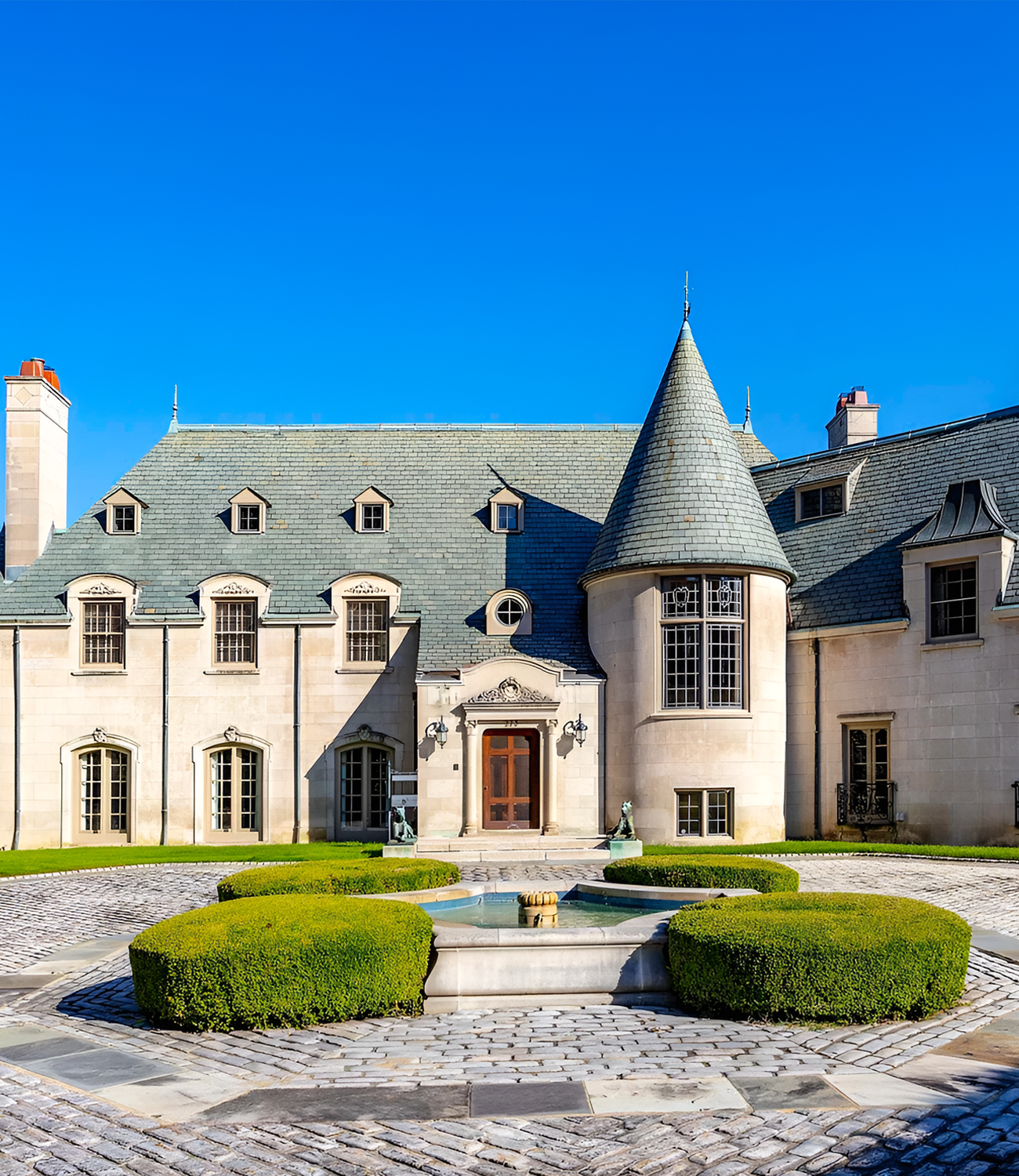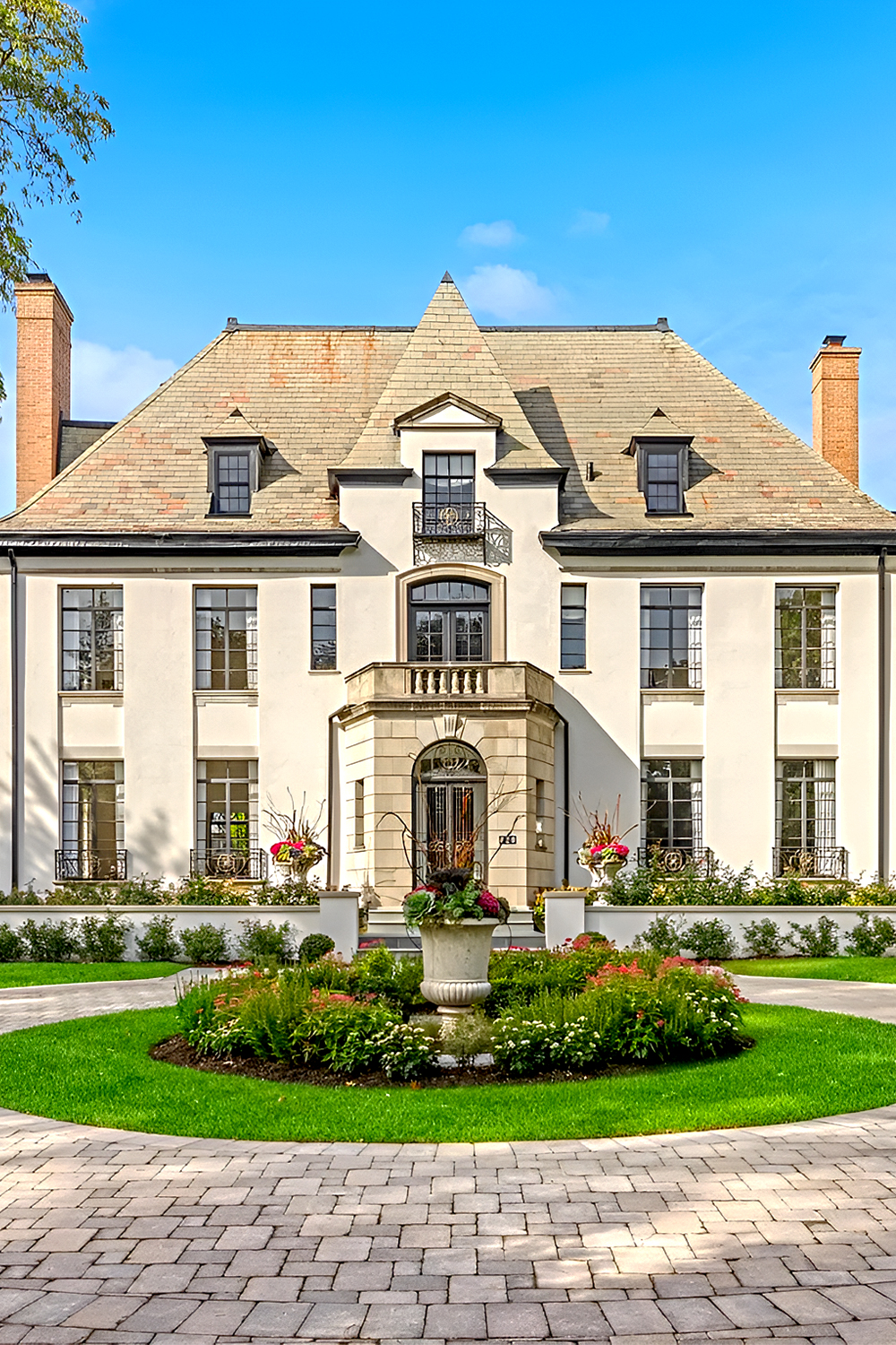 This breathtaking home stands tall and proud, wrapped in creamy stucco with stone accents. The steeply pitched hip roof, with its slate tiles, gives it that signature chateau look. Two grand chimneys rise up like castle towers, while the central entryway—framed by a balcony and classic wrought iron railings—makes you feel like royalty the moment you arrive. The sweeping circular drive centers on a formal garden and stone urn, setting the stage for true elegance. Notice the tall, symmetrical windows, black trim, and the refined lines that make this home look both stately and welcoming.