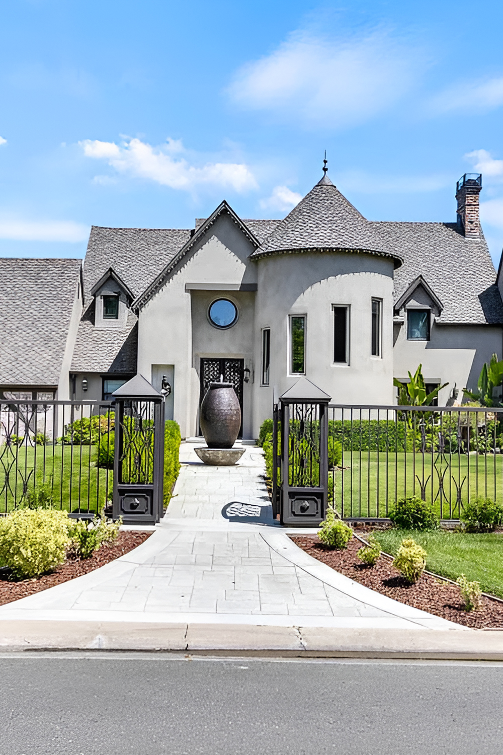 Last, but never least, is a home that feels straight out of a fantasy novel. The massive turreted entry, circular windows, and peaked gables all shout “French chateau.” The light, stuccoed exterior pairs with a stone round tower for a fortress-like feel. Neatly fenced lawns and sculpted landscaping guide you up a broad, welcoming path. The oversized urn and iron gates at the entry add an artistic statement, while gabled dormers and arched windows keep the look playful and refined. This home captures both strength and whimsy—truly a showstopper.