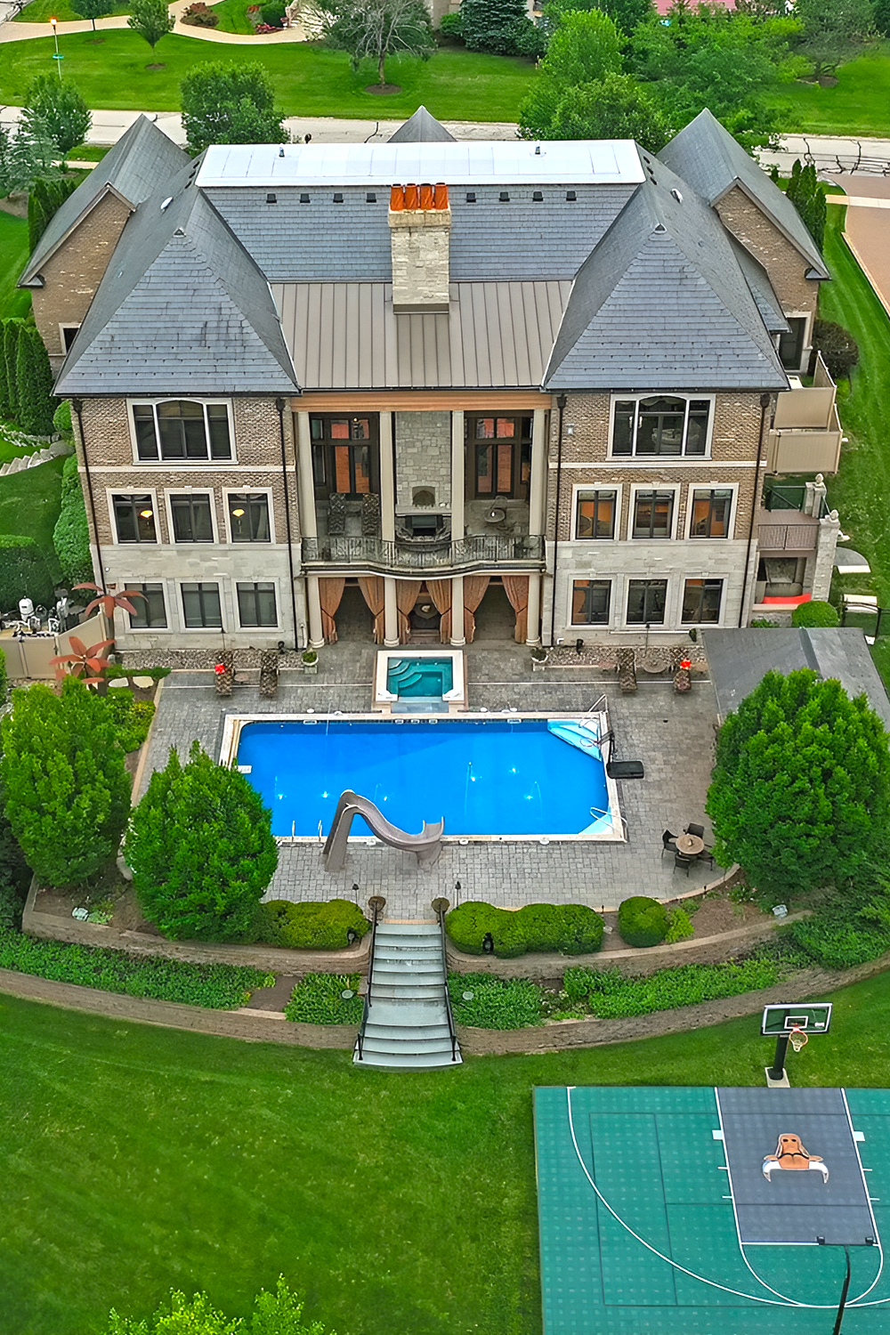 Here’s a French chateau with a bold, modern twist! It stands tall and stately, with gray slate roofs, impressive brickwork, and elegant symmetry. The backyard is all about fun, featuring a sparkling pool with a slide and a full basketball court—luxury and play in perfect balance. The multiple chimneys, peaked dormers, and rows of windows give this home a commanding presence. Sculpted hedges, neat pathways, and manicured lawns make the entire estate look picture-perfect. With its wide terraces and plenty of space, this is a chateau made for both grand entertaining and everyday family memories.
