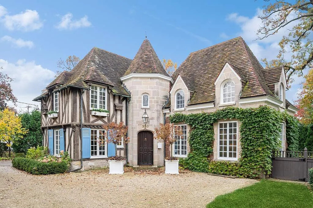 This home captures the rustic, whimsical charm of rural France. Weathered timber frames, stonework, and cheerful blue shutters create instant warmth and personality. The round stone turret acts as a focal point, topped by a pointed roof straight from a storybook. Ivy climbs along the side, softening the walls, while flower boxes and lush plantings brighten the façade. With its mix of half-timbering and stucco, this cottage-like chateau feels old-world, inviting, and full of history—perfect for anyone who dreams of a fairy-tale escape.