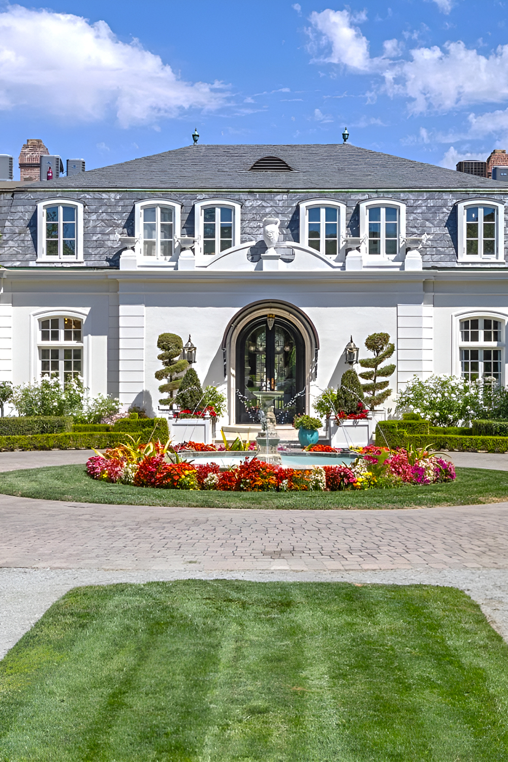 This home looks like it belongs on a grand estate in the Loire Valley. Creamy stone covers the exterior, set off by sculpted dormer windows and iron-railed Juliet balconies. The entry is regal, with a rounded arch and a medallion above the double doors. Four chimneys, three stories, and rows of perfectly aligned windows give it a sense of grandeur. The front lawn stretches out like a green carpet, with formal walkways guiding you to the entrance. Pointed topiary trees and layered flower beds create a manicured, stately look.