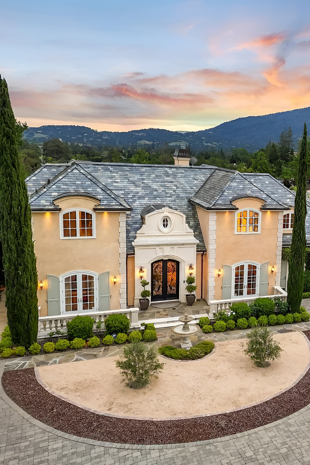Soft, golden stucco and minty green shutters welcome you to this sunlit French retreat. Elegant arches and symmetrical design draw the eye toward the ornate entry, where double doors sit under a decorative pediment. The detached, matching garage creates a courtyard feel. Mature cypress trees, clipped hedges, and lush plantings add to the storybook setting. The paver driveway curves to the front, ending at a graceful fountain, perfect for an afternoon stroll or sunset view. Details like the curved windows, gentle exterior lighting, and stone balustrades evoke timeless French sophistication.