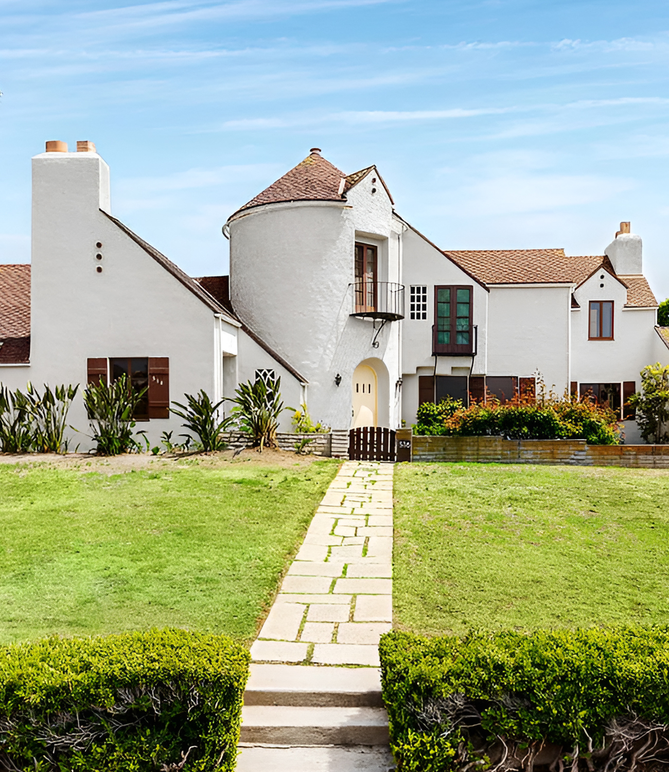 This house looks straight out of a fairy tale, thanks to its round, turreted tower. Crisp white stucco pairs with rich brown roofs for a fresh yet classic look. French doors and windows pop against the walls, adding symmetry and character. The arched entryway welcomes you like a castle gate, flanked by cheerful gardens and leafy palms. A gentle stone path guides you across the lawn, creating an inviting approach. Rustic wooden shutters and iron balcony rails sprinkle in old-world charm. This home blends whimsy and elegance, promising every day feels special.