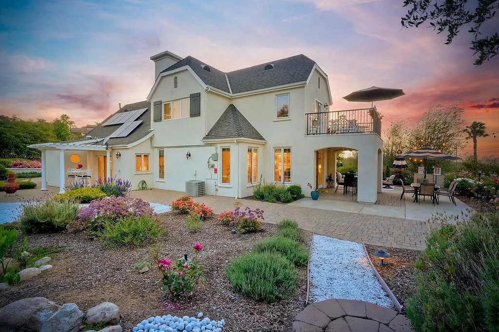 The first home glows under a cotton-candy sunset. This chateau-inspired beauty is wrapped in creamy stucco, with crisp rooflines and soft, sloping gables. Solar panels peek out, blending eco-friendly living with classic style. Tall, shuttered windows invite in the evening light, while the upper terrace calls out for breezy summer dinners. The back patio sprawls with seating and umbrellas, perfect for parties or quiet family nights. Flower beds in pinks, purples, and greens frame the house, while a playful garden path winds through lavender and stones. The mix of open space and cozy nooks creates a dreamscape you’ll never want to leave.