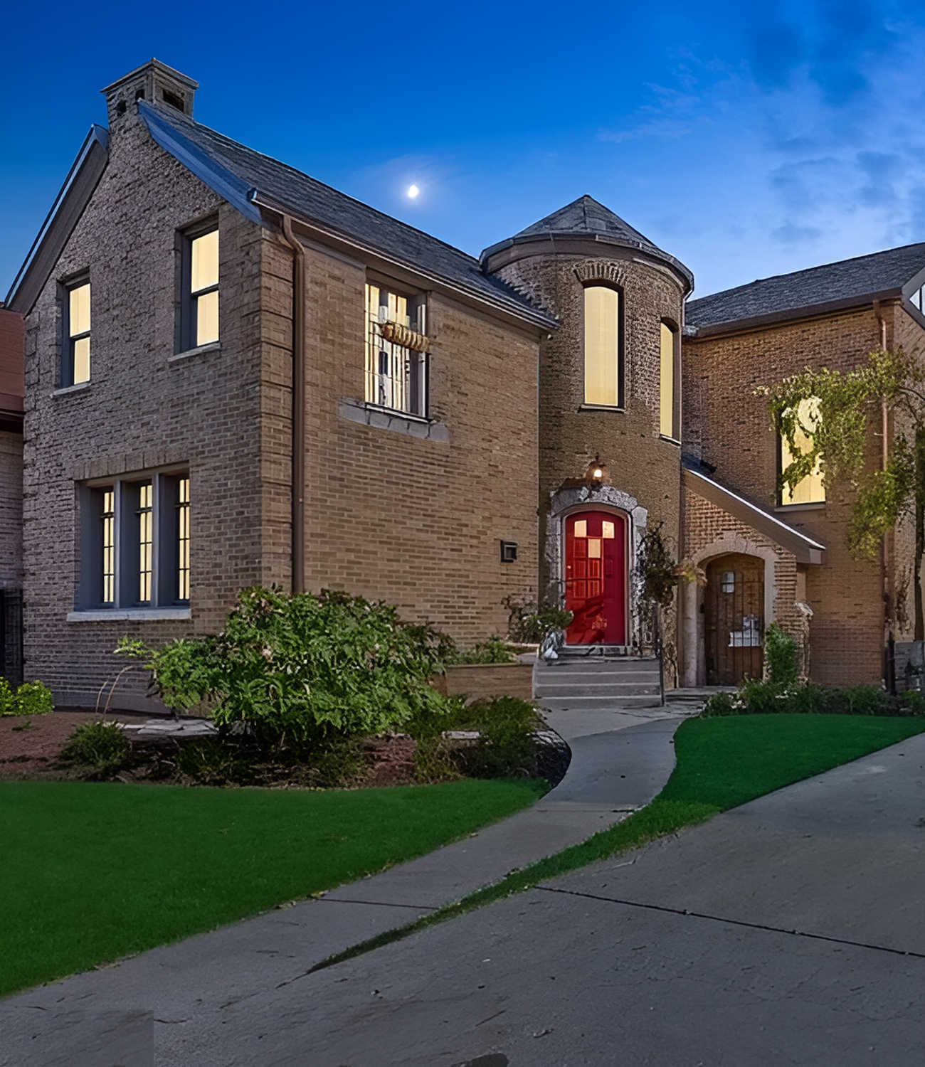 This home offers a whimsical spin on the chateau look, with its brick exterior and distinctive turret. The rounded stone entry with a bright red door creates a warm, inviting welcome. Steep gables and classic Tudor elements mix with French-inspired details, such as leaded glass windows and a tall chimney. The curved walkway, landscaped beds, and trimmed shrubs add character and charm. Evening lighting makes the house glow, adding a magical touch at dusk.