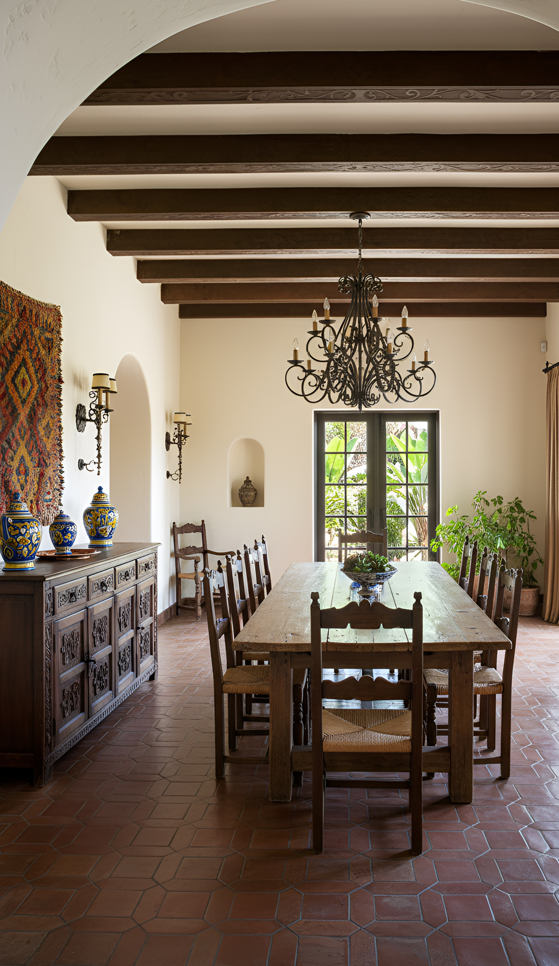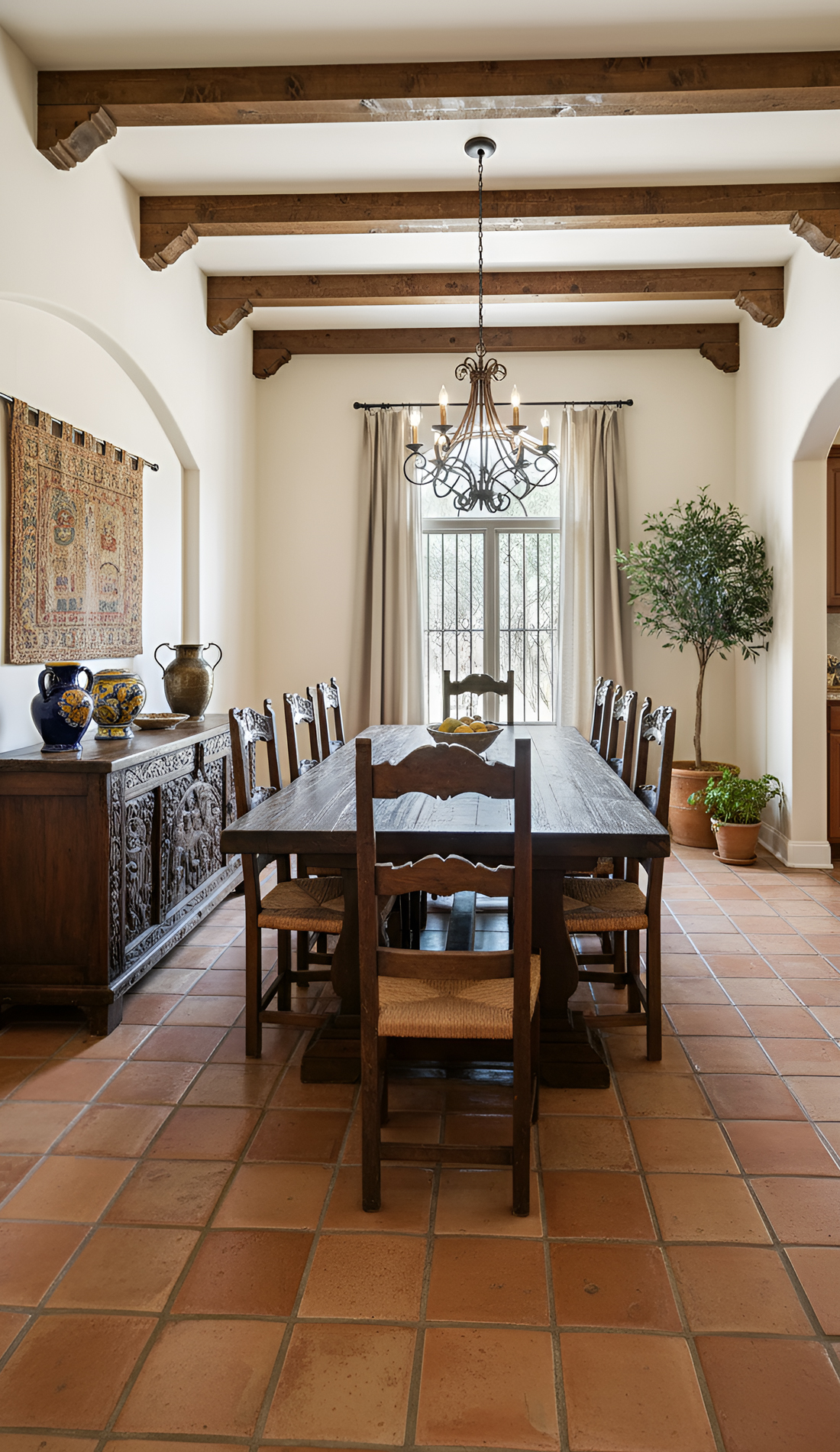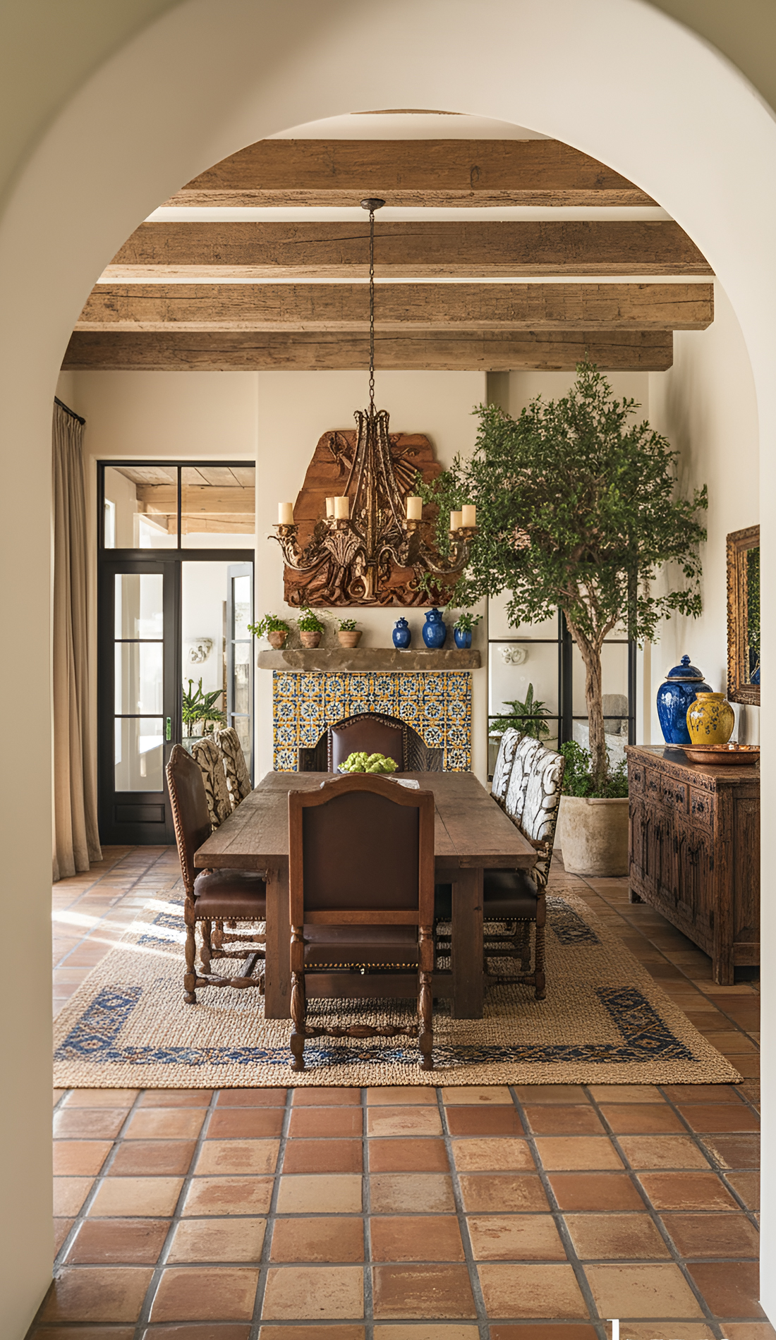A Spanish Revival dining room feels cozy, layered, and full of character. It mixes rustic beauty with elegant details in a way that never feels too formal. From terracotta floors to carved wood furniture, each element adds warmth and soul. Use these ideas to create a dining room that feels inviting, stylish, and made to gather in.
