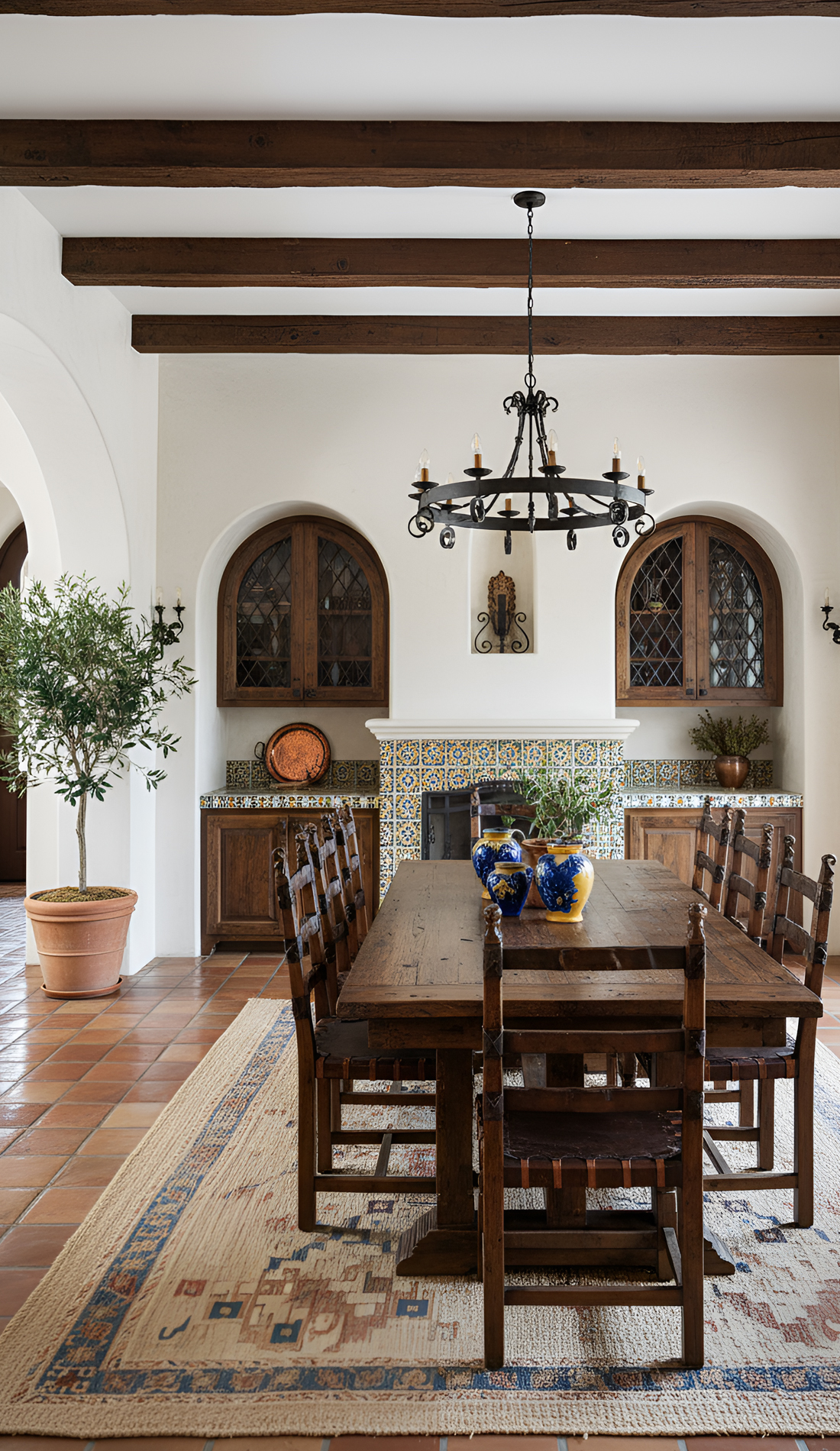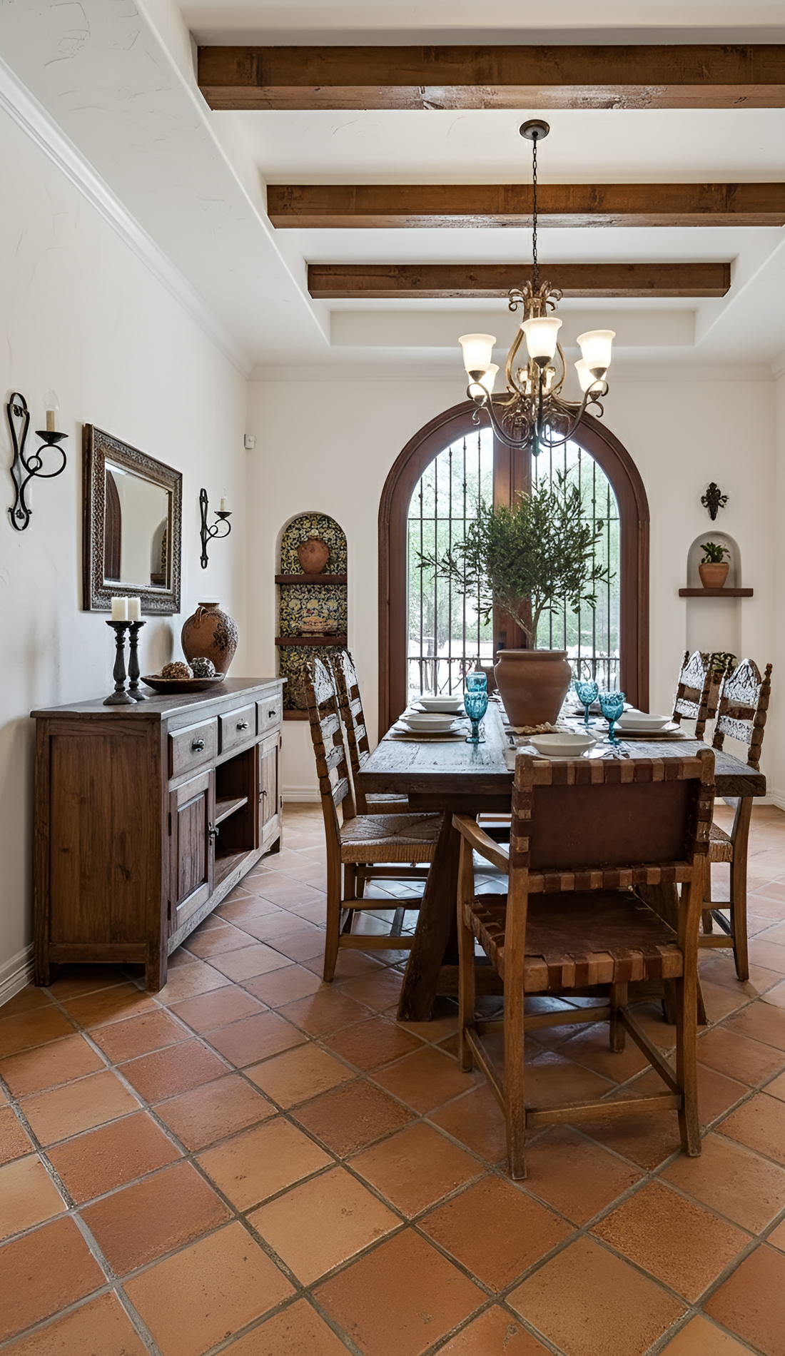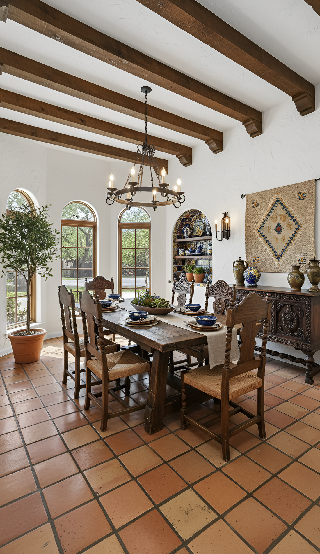 A Spanish Revival dining room feels cozy, layered, and full of character. It mixes rustic beauty with elegant details in a way that never feels too formal. From terracotta floors to carved wood furniture, each element adds warmth and soul. Use these ideas to create a dining room that feels inviting, stylish, and made to gather in.