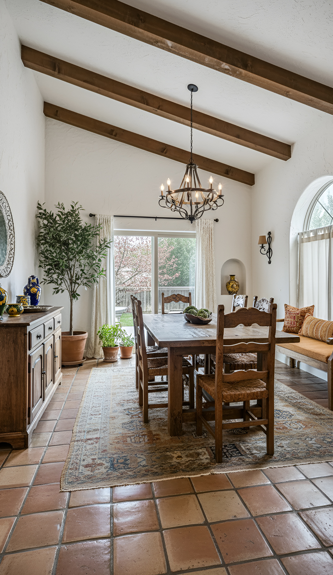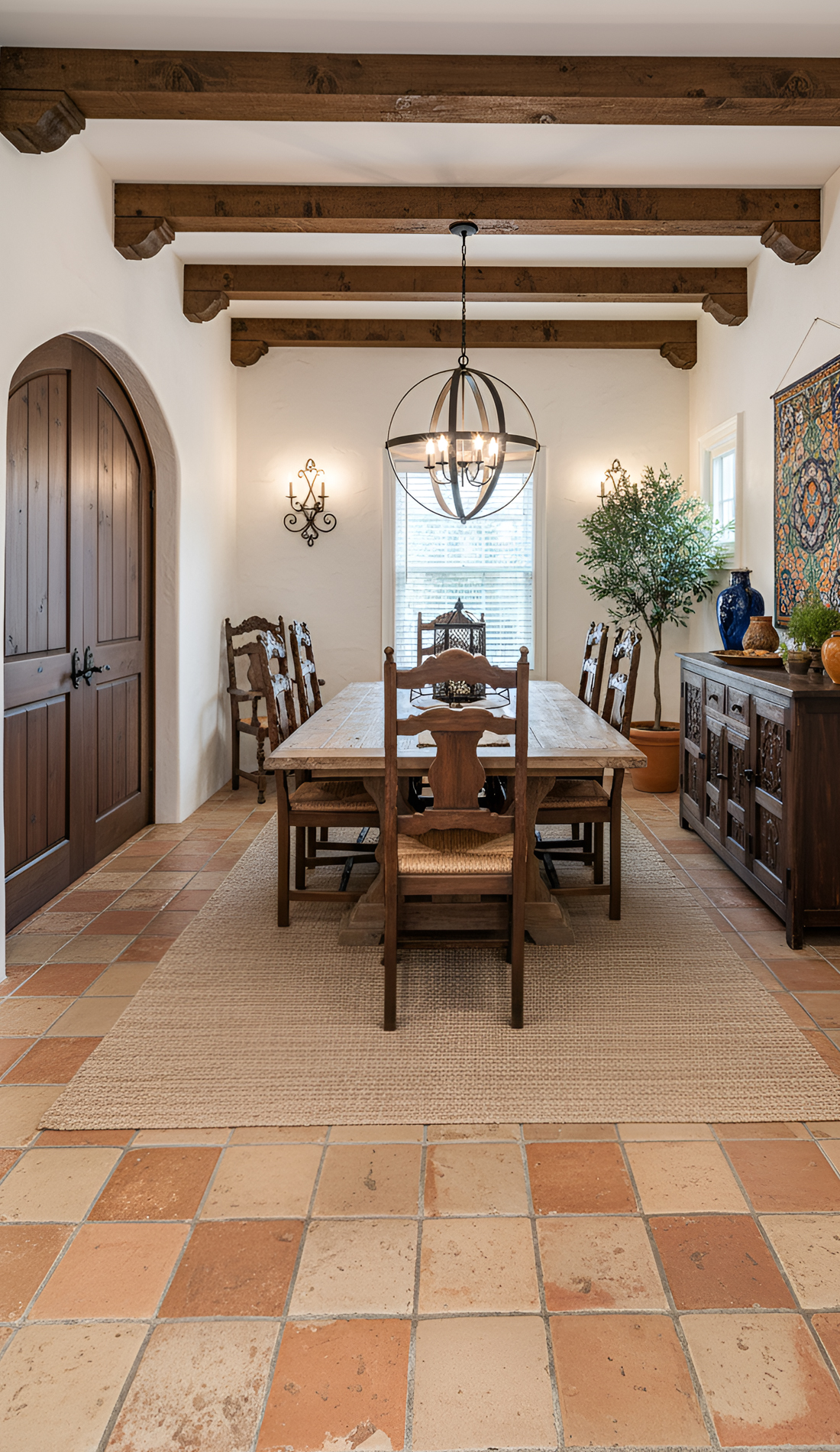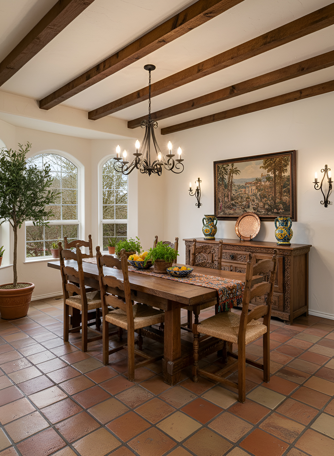 If you want a dining room that feels warm from the ground up, terracotta flooring is a beautiful place to start. Terracotta has that sun-baked, old-world look that fits Spanish Revival style perfectly. Its natural color adds warmth. Its handmade quality adds character.