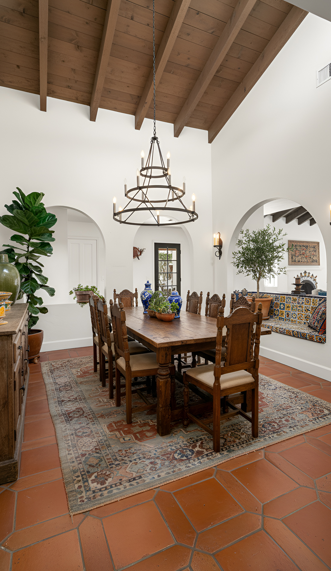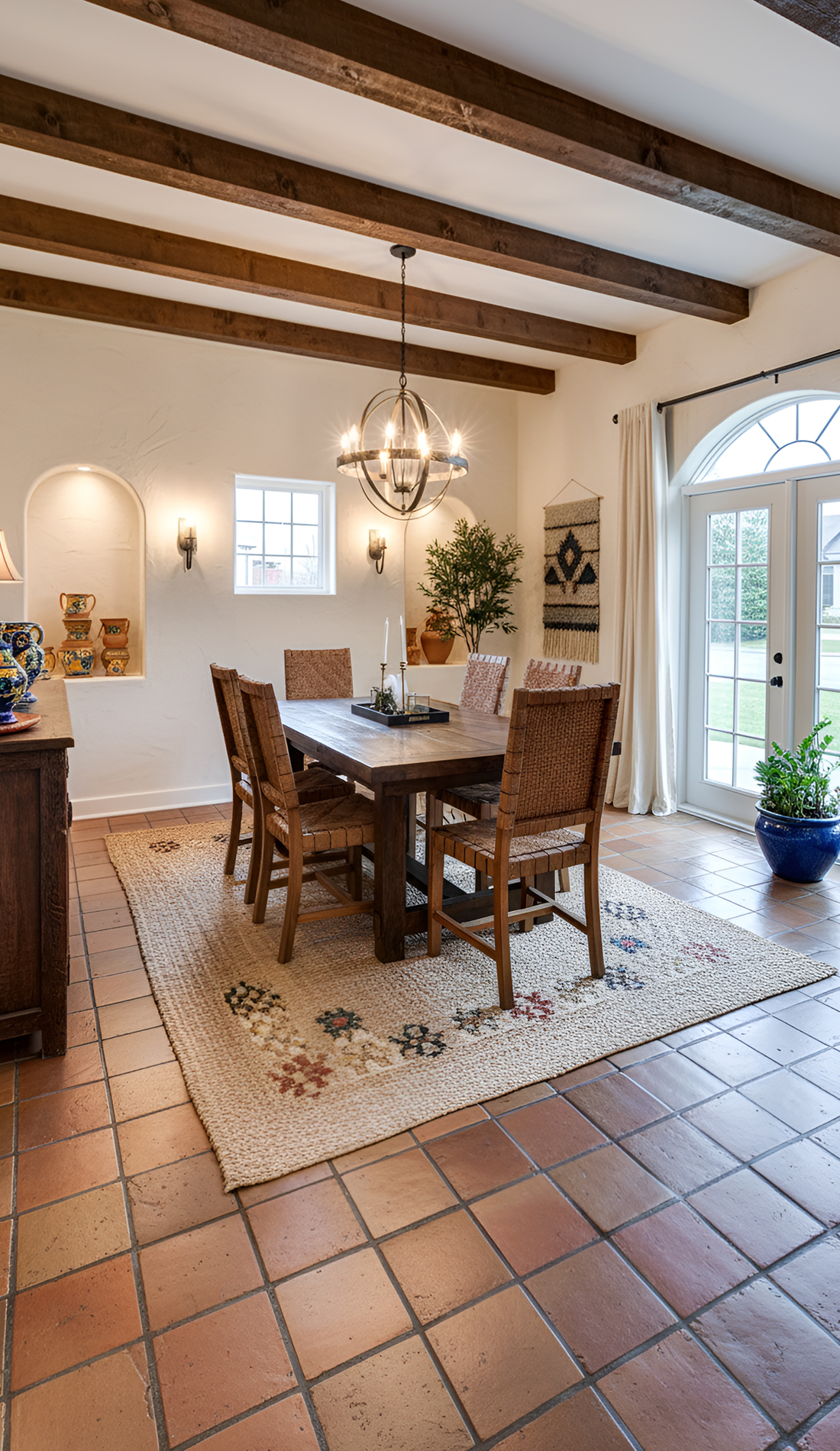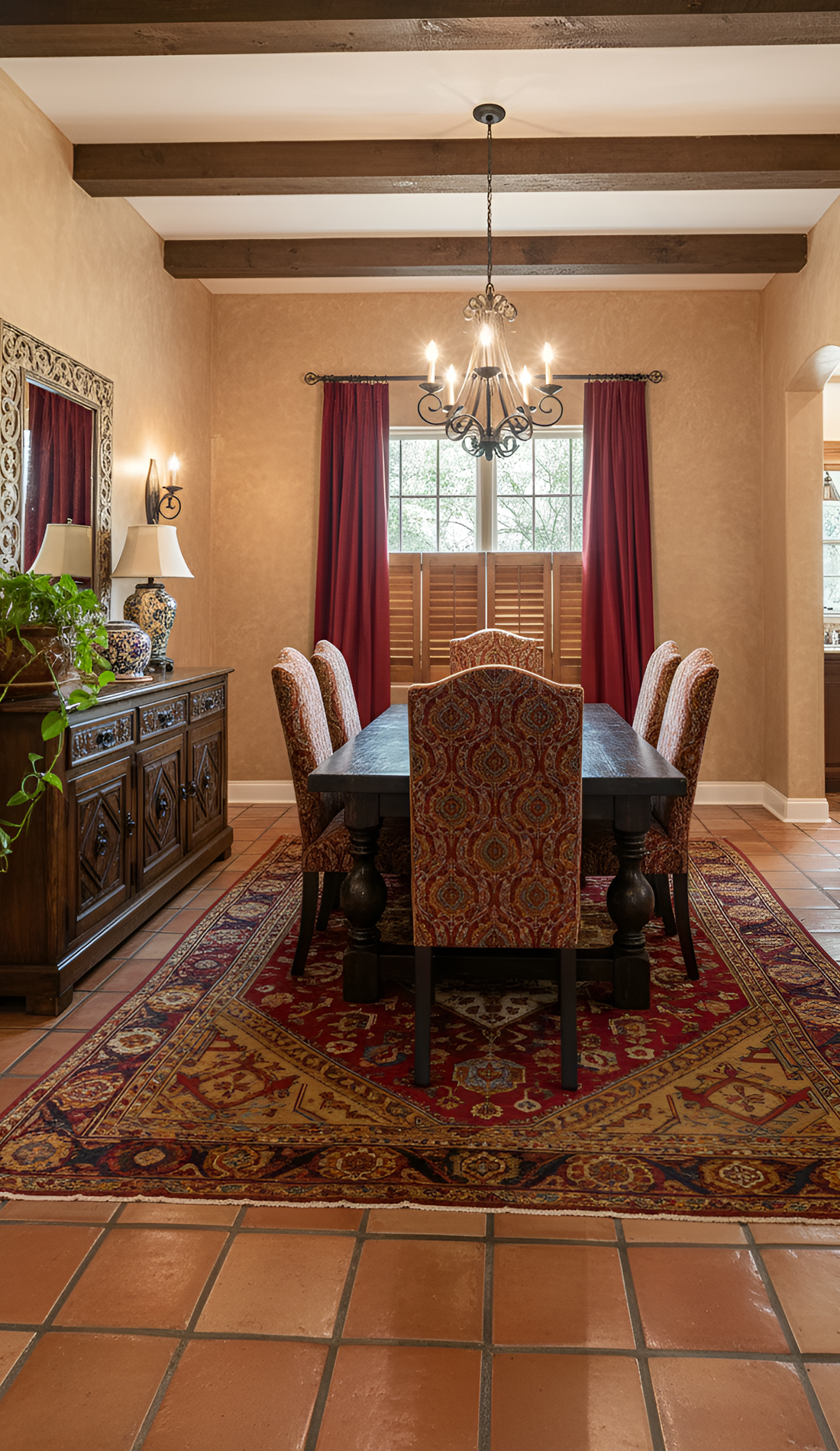 If you want a dining room that feels warm from the ground up, terracotta flooring is a beautiful place to start. Terracotta has that sun-baked, old-world look that fits Spanish Revival style perfectly. Its natural color adds warmth. Its handmade quality adds character.
