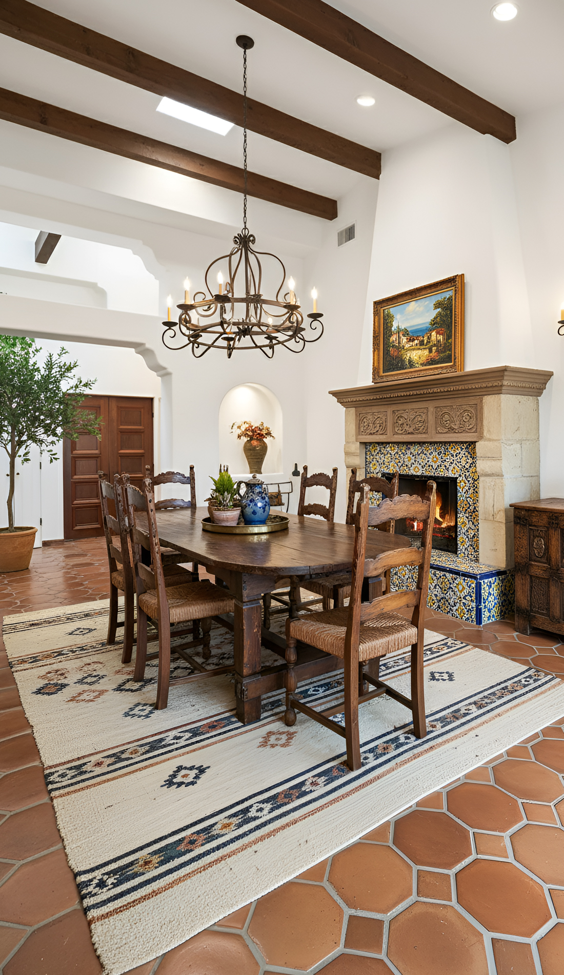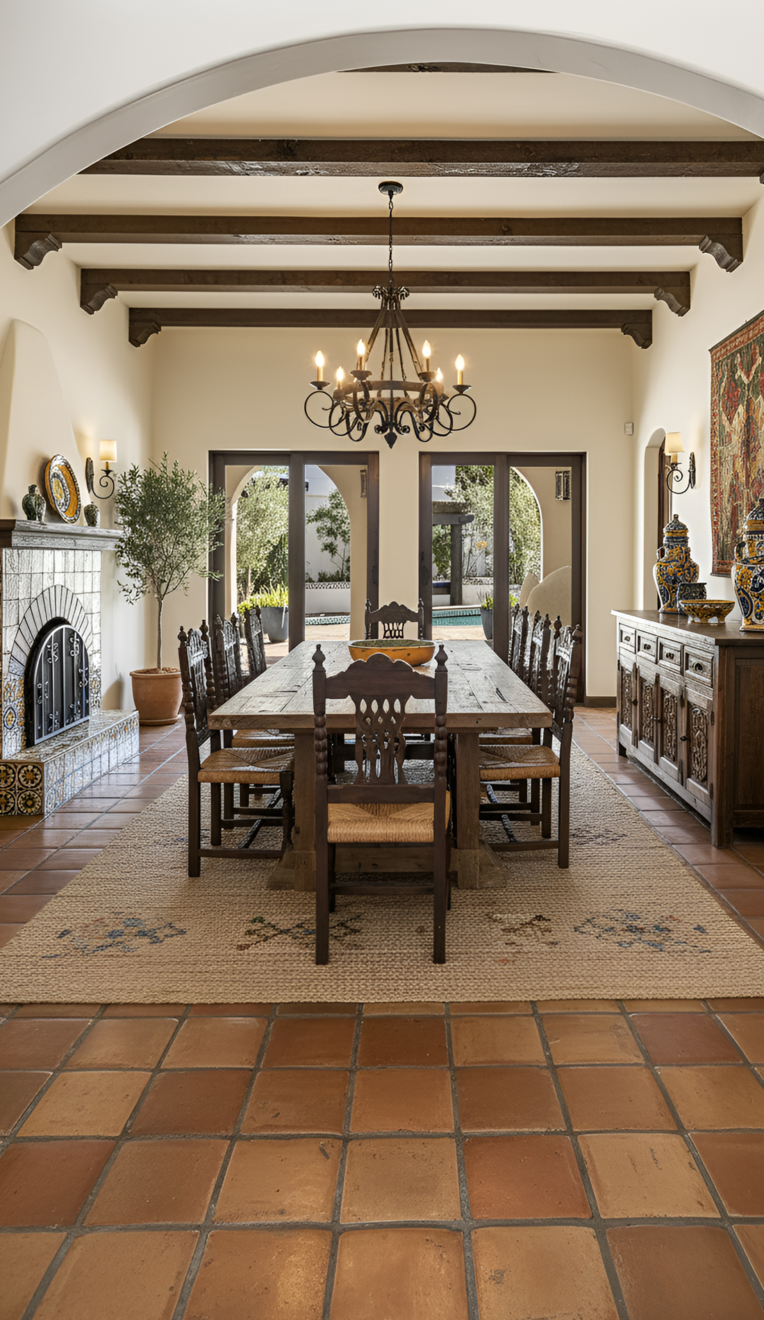 A fireplace can make a Spanish Revival dining room feel truly special. It becomes a natural focal point. It also adds the kind of warmth that makes the whole room feel intimate and memorable.