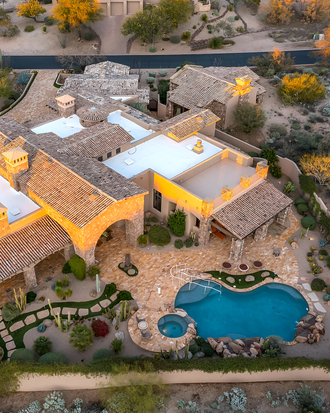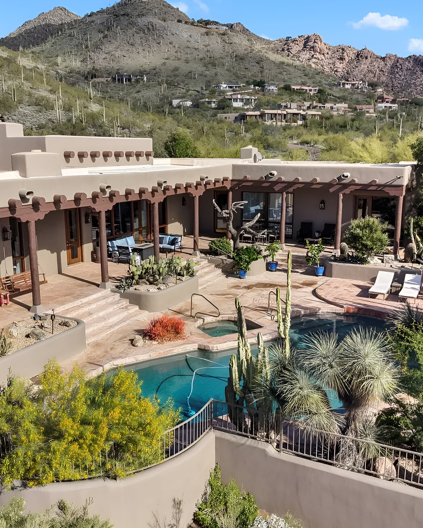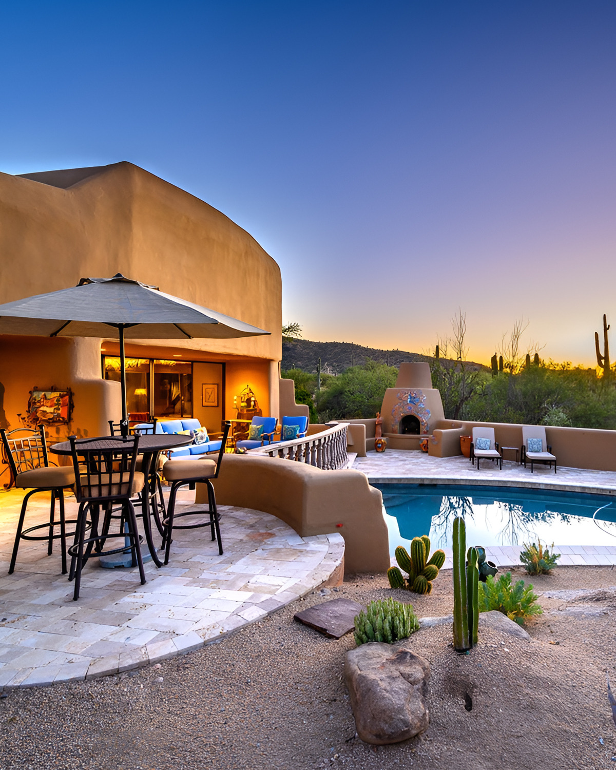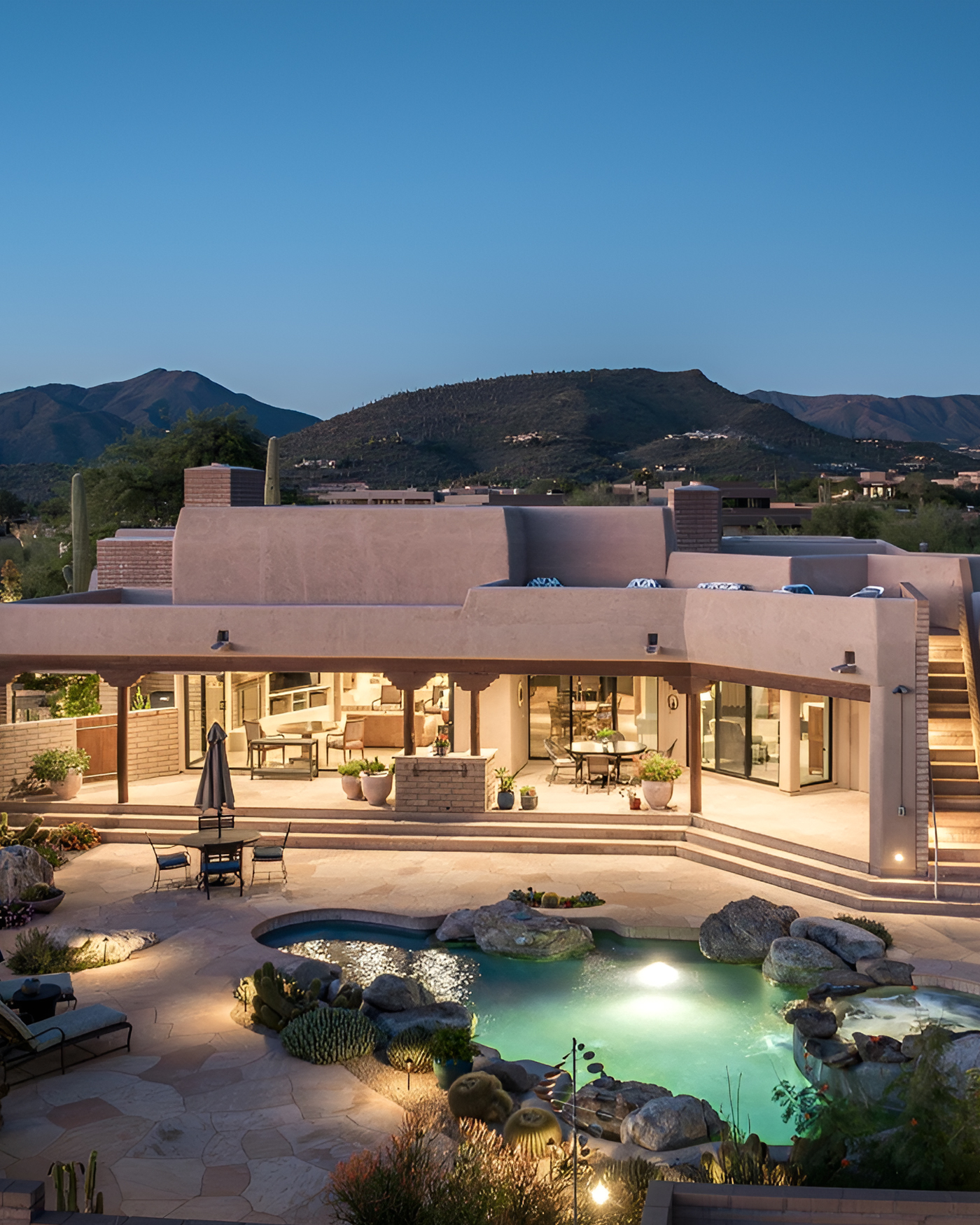 What makes this space special is the material mix. Stone, stucco, tile rooflines, and desert planting all show up, but none of them compete. They build off one another. That layered look is a big part of why high-end Southwestern homes feel so inviting.
