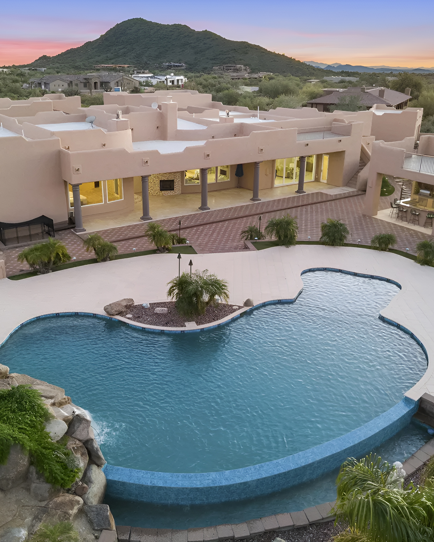 This backyard goes big, but it still keeps a Southwestern soul. The huge freeform pool feels almost like a resort lagoon, while the broad pale deck gives the space room to breathe. The house sits back with a long covered patio, so there is plenty of space for entertaining, relaxing, and moving around.