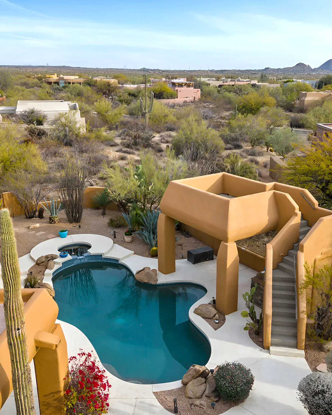 This backyard feels like a private desert resort perched above the landscape. The long, narrow pool pulls your eye straight toward the mountain view, while the raised round spa gives the layout a bold focal point. Large boulders soften the pool edge and make the water feel tucked into the terrain instead of dropped into it. Meanwhile, the terracotta-toned paving brings warmth and keeps the whole setting true to Santa Fe style. The covered patio opens right to the water, so the house and backyard read as one big living space.