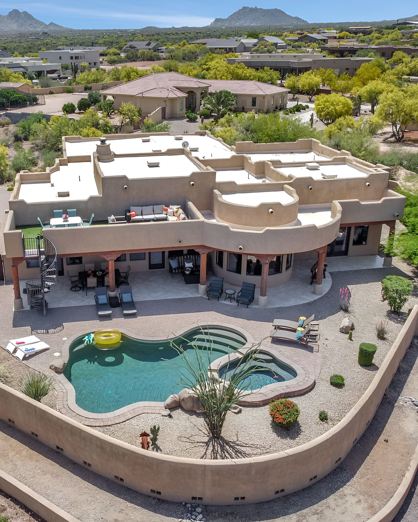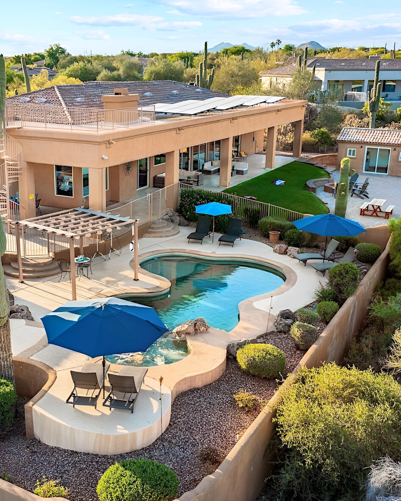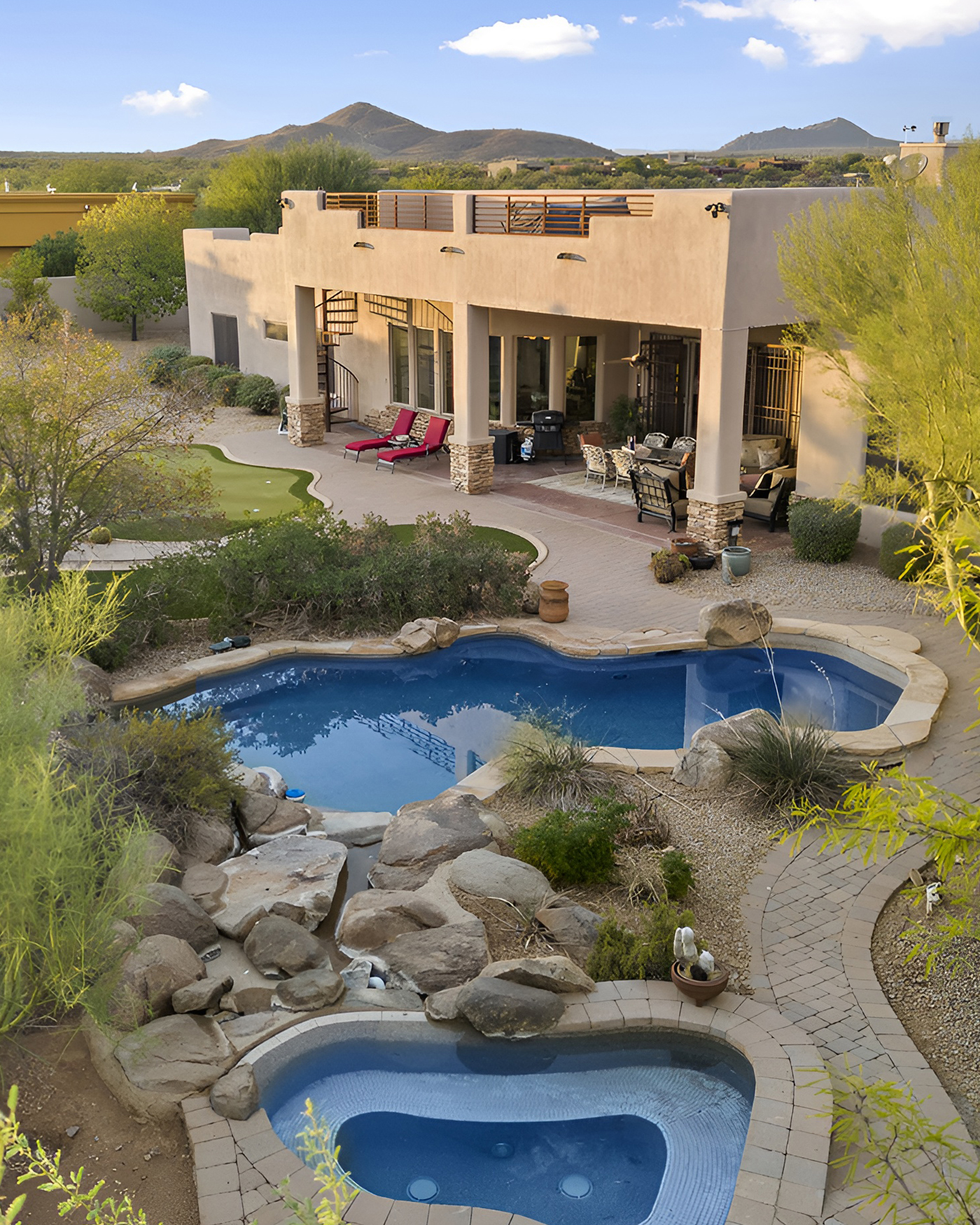 This backyard uses height to its advantage. The upper balcony and tall massing give the home a strong presence, while the curving pool keeps the yard feeling relaxed and playful. Desert plants fill the edges of the yard, which softens the hardscape and helps the property feel rooted in the landscape.