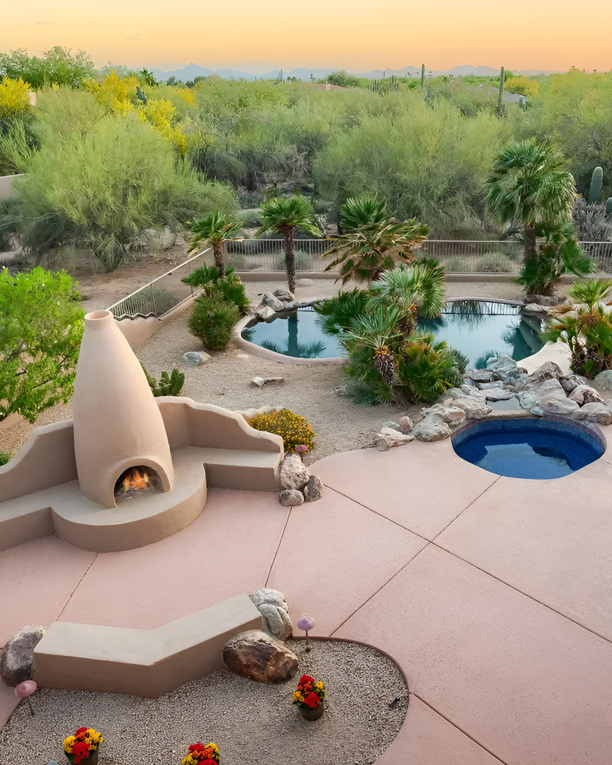 This backyard puts the patio first. The pool sits off to the side like a desert lagoon, while the huge paved terrace creates room for gatherings, outdoor dining, and relaxed evenings by the fire. The kiva fireplace becomes the main sculptural feature, which gives the yard strong Santa Fe character even before you notice the pool.