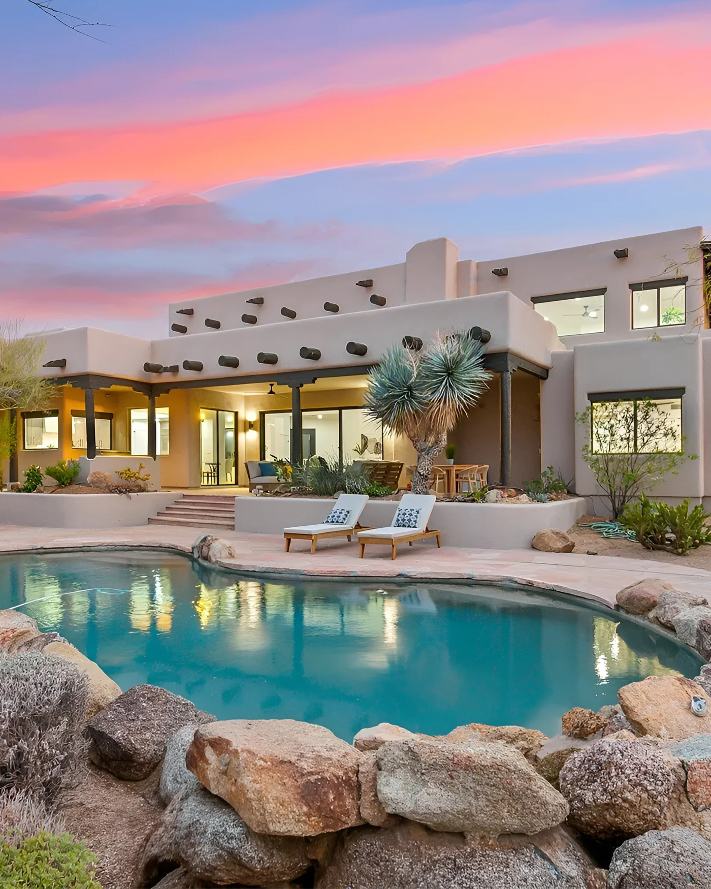 This backyard feels like a newer take on the style. The house has cleaner detailing and sharper lines, but the pool, stone edging, and desert palette keep it warm. The pool itself has a simple organic shape, while the rock border adds just enough roughness to ground the design.