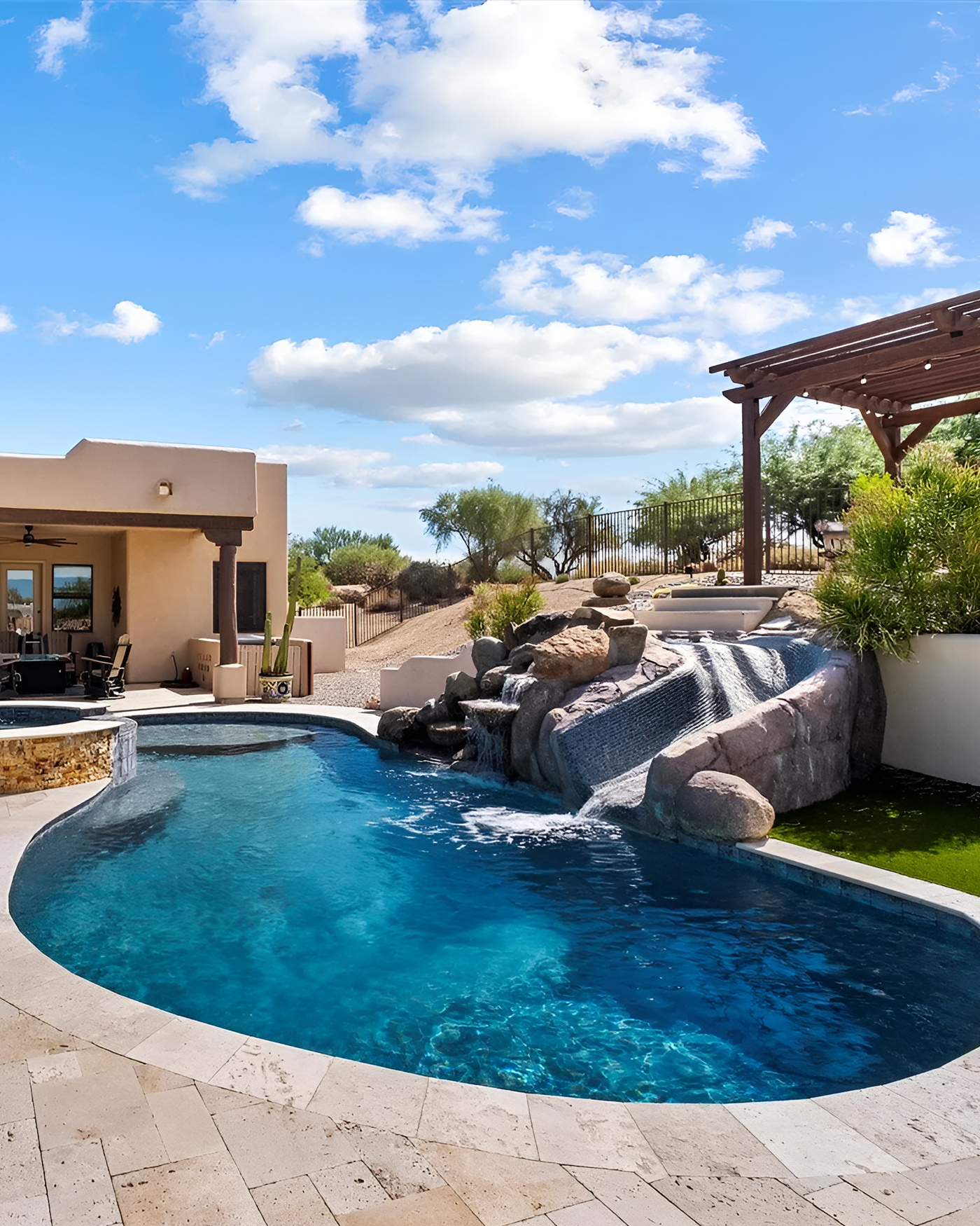 This backyard shows how Santa Fe style can look fresh and current. The house has simple stucco forms and a broad covered patio, but the pool keeps the space from feeling plain. Its curved shape softens the straight edges of the house, and the rock waterfall adds movement and texture. The raised round spa, finished in stone, becomes a strong centerpiece without feeling too formal.