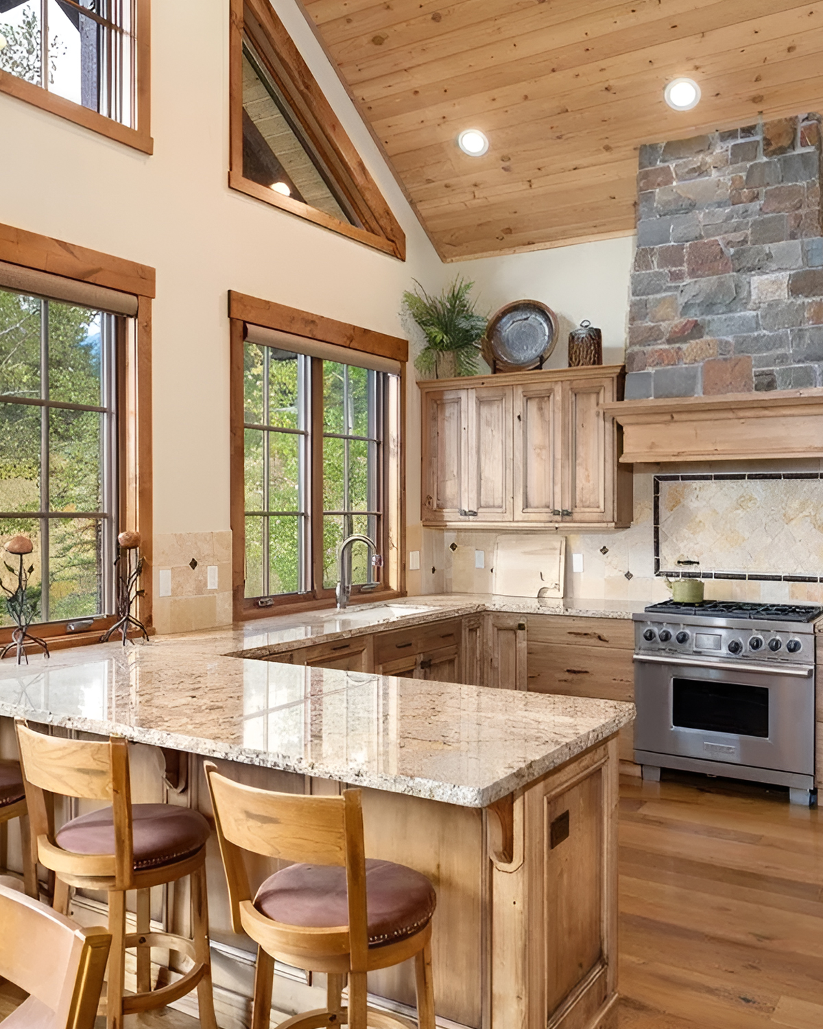 This is a smart way to add “mountain magic” without filling every wall with wood. The stone surround creates a bold focal point. Meanwhile, lighter cabinetry and tall windows keep everything bright.