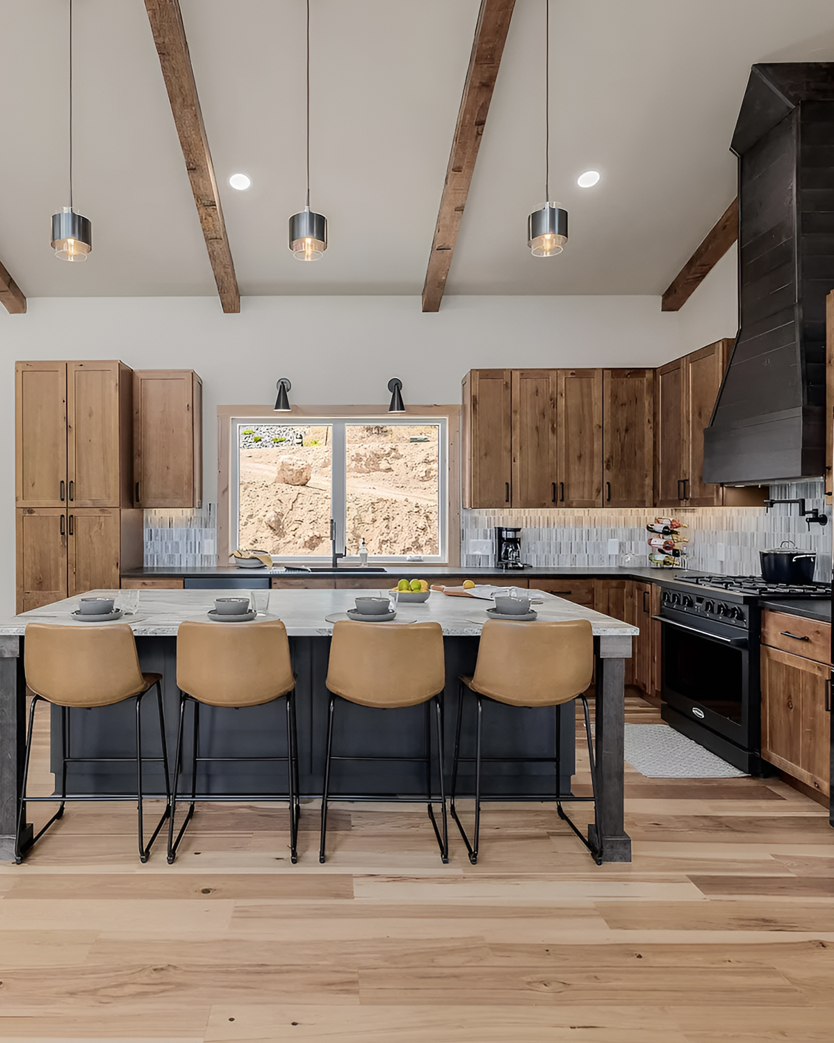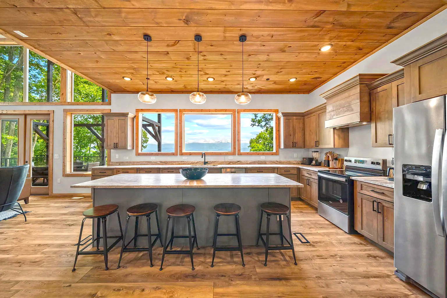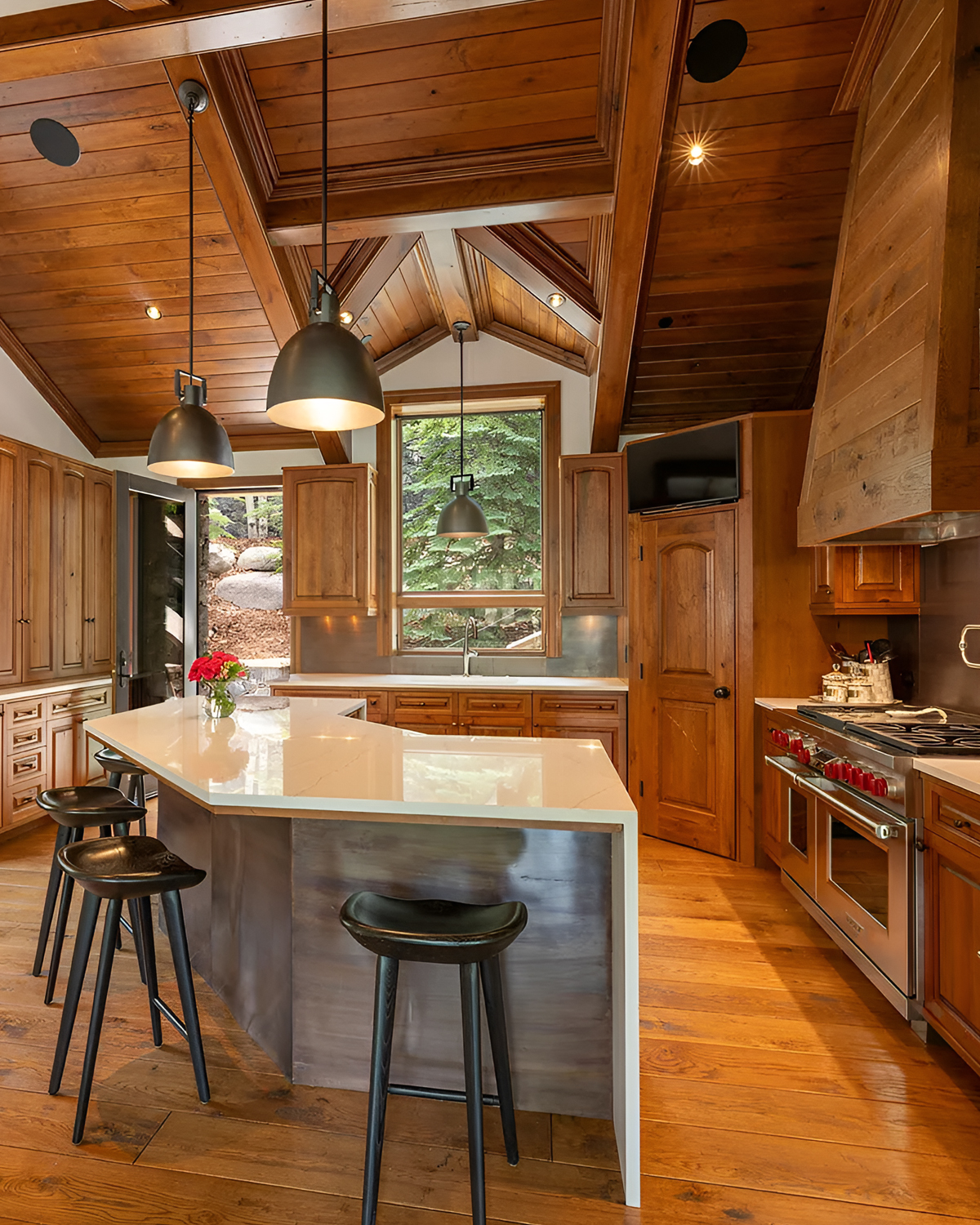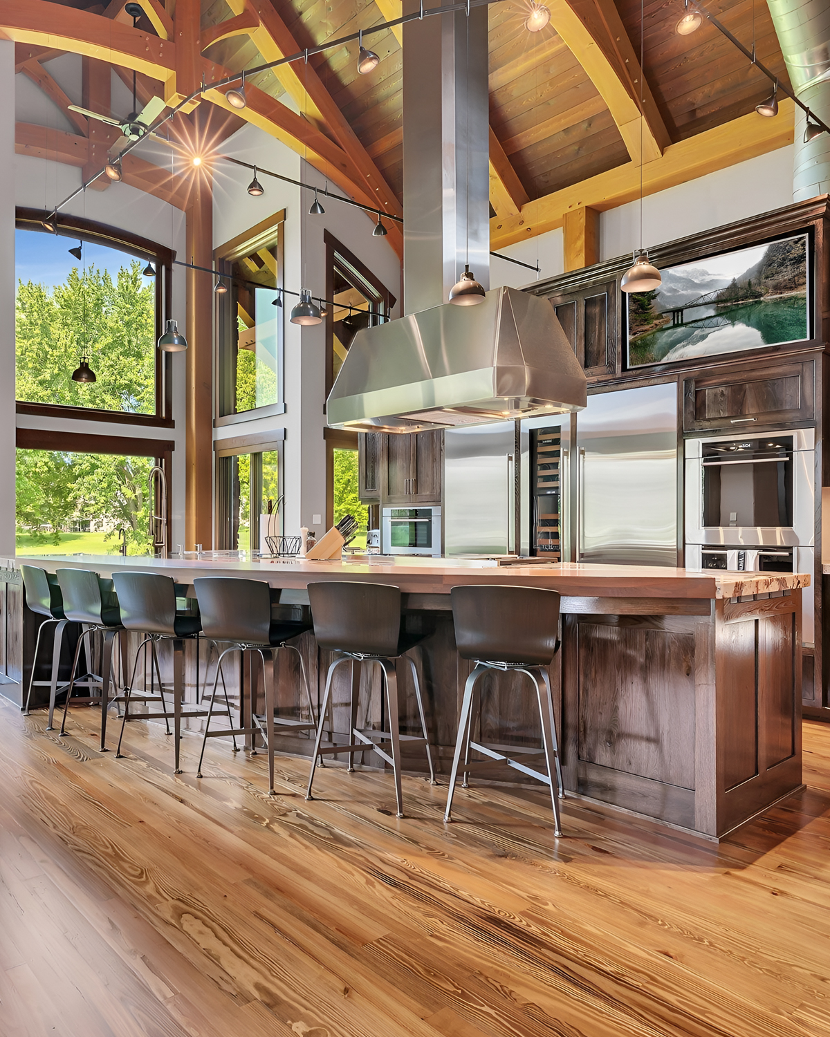 This kitchen says “wow” before you even spot the view. The structure does the heavy lifting. Those timber trusses pull your eyes up, while the massive stainless hood brings in a pro-kitchen vibe. It’s rustic, but it also feels high-end.