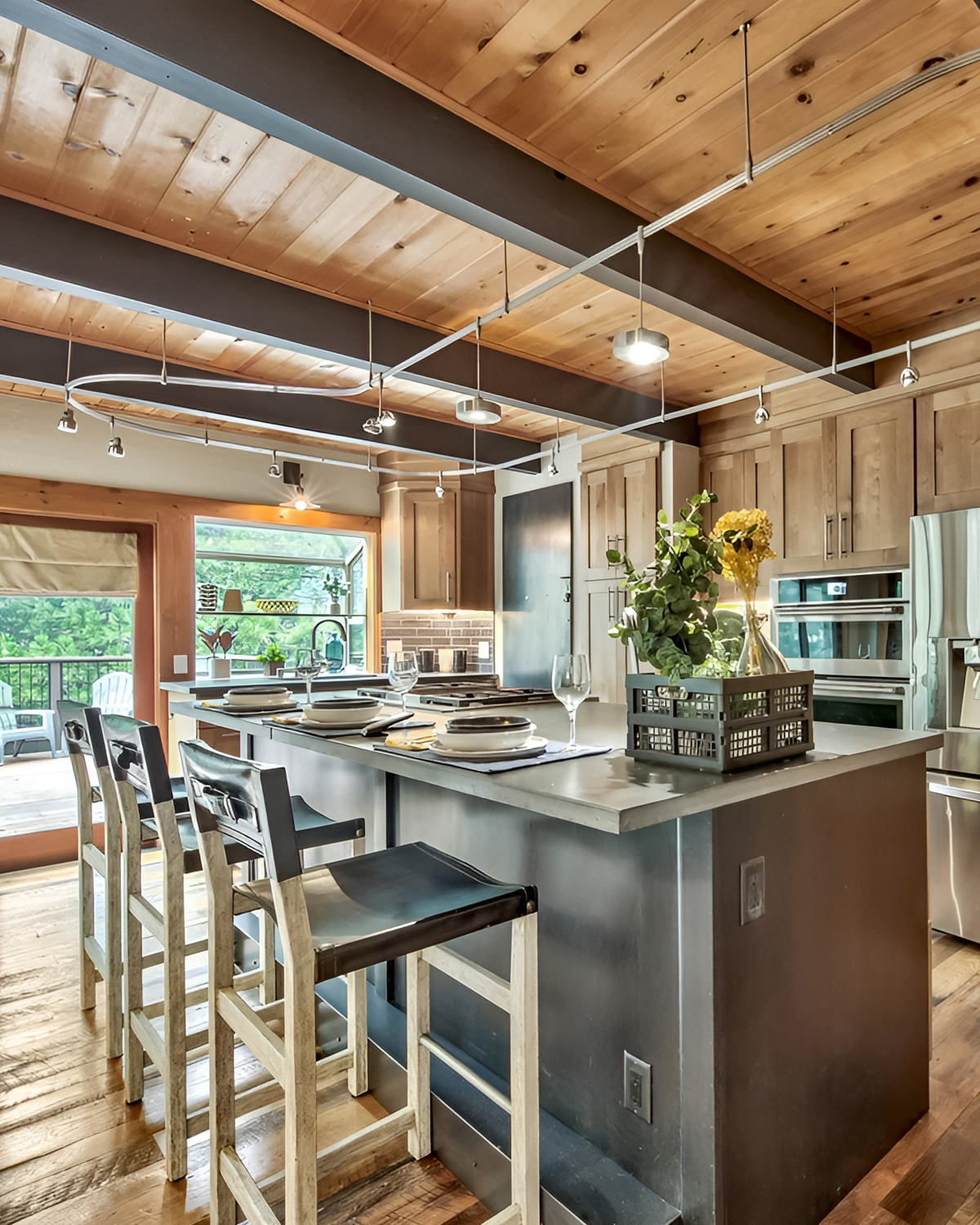 Here’s the mountain look with an urban edge. The ceiling shows off steel beams and track lighting, which feels a bit loft-like. Still, the wood ceiling keeps it warm, so it never turns cold or factory-like.