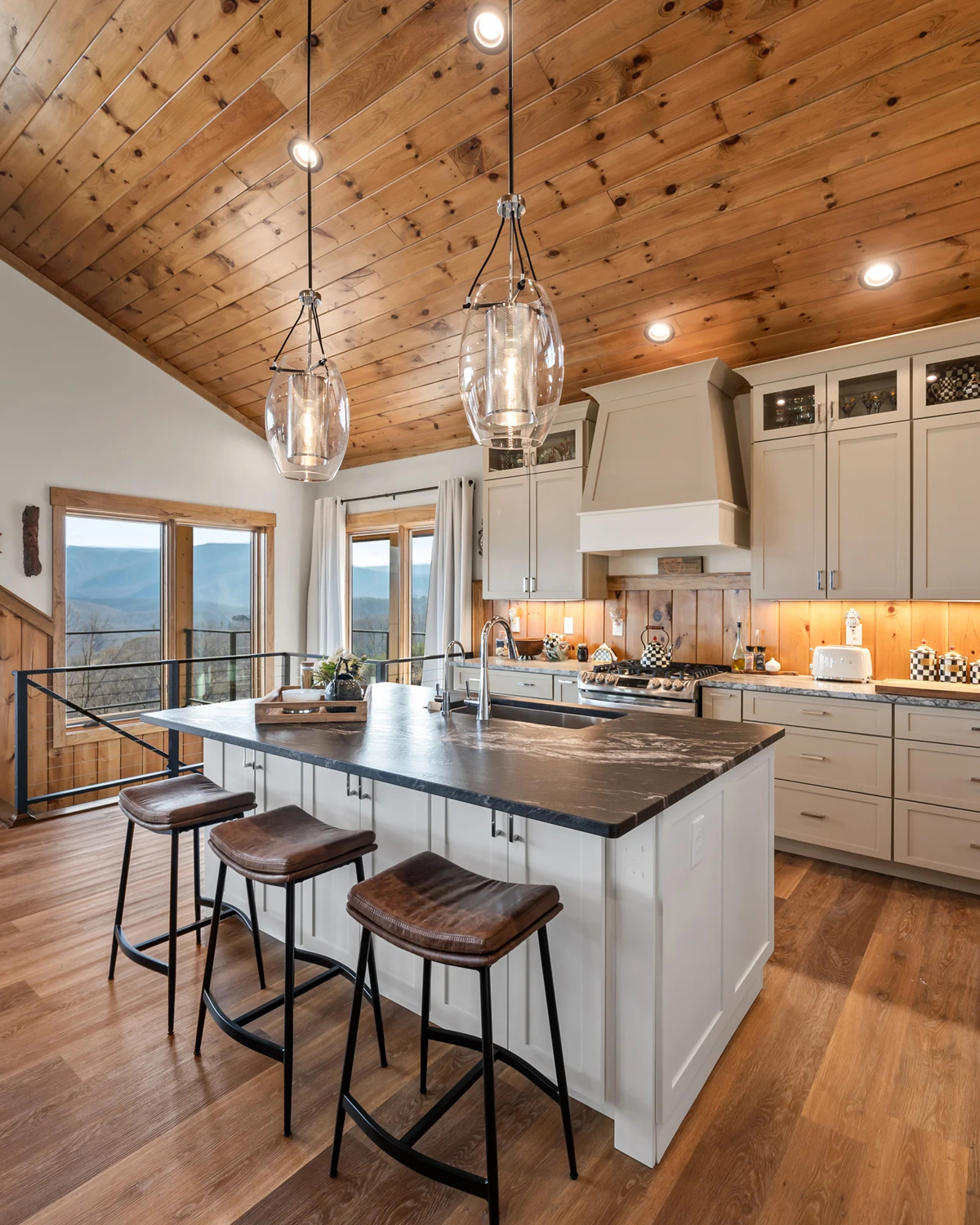 This one is clean, but not sterile. The cabinetry stays light, the ceiling stays wood, and the lighting stays warm. That combo feels inviting day and night, especially with the mountain view pulling you in.