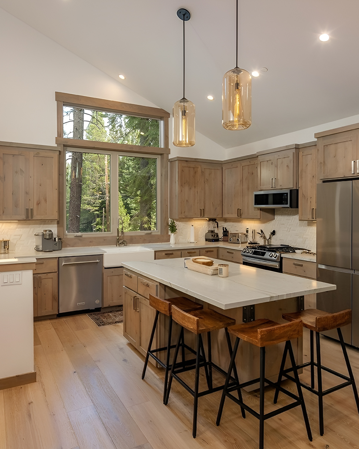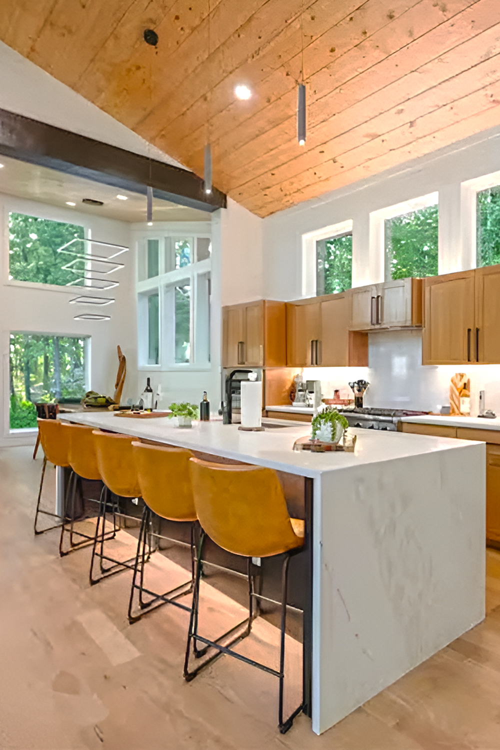This kitchen feels light, fresh, and wide open. The waterfall island looks sleek, yet the wood ceiling keeps it cabin-cozy. Those high windows pull in treetop views, so the room feels alive all day.